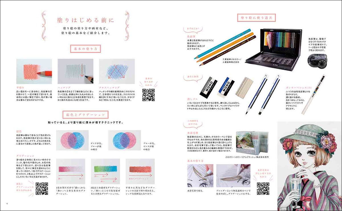 塗り絵に使うおすすめの道具や、基本の塗り方、女の子や猫の塗り方のコツも掲載。