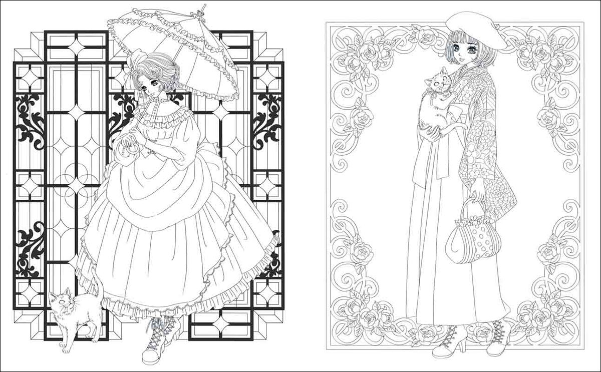 自由で個性的な和洋折衷が作り出すモダニズムと、いつの時代も変わらずそばにいるかわいい猫ちゃんのストーリーを想像しながら、楽しく塗り進めることができます。