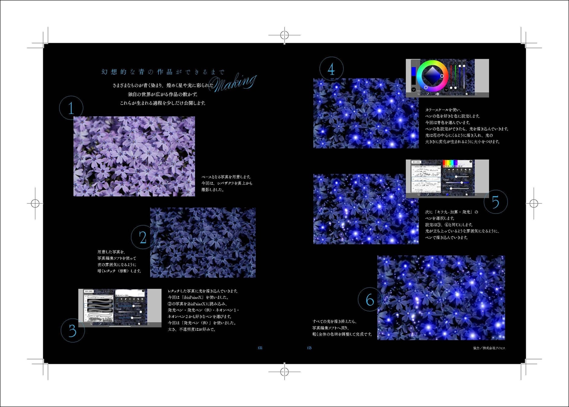 さまざまなものが青く染まり、煌めく星や光に彩られた独自の世界が広がる作品の数々。これらが生まれる過程を少しだけ本書で公開しています。ペイントソフトの設定など、細かいテクニックも紹介しているので、参考になること間違いありません。