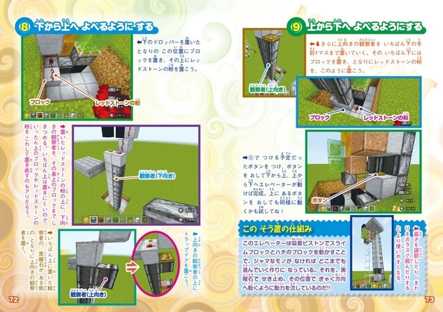 レッドストーン装置を大解説した1冊! レッドストーンの基本はもちろん、入力・伝送・出力装置の一覧やクロック回路などの基本的な回路の作りかたを解説。もちろんゲキスゴ装置の作りかたも連続写真で徹底的にフォローしています。