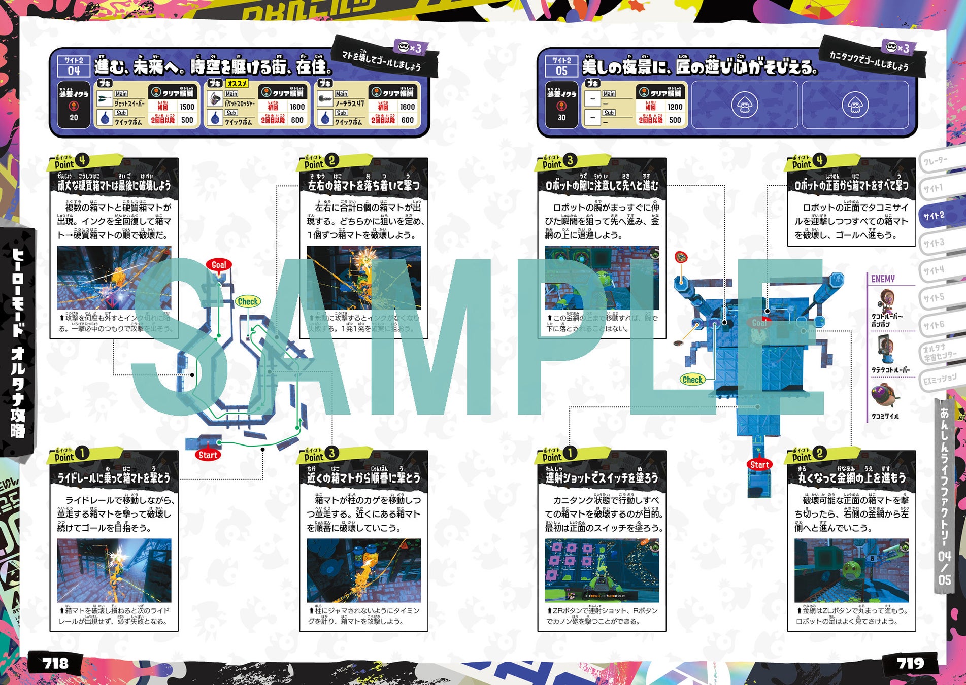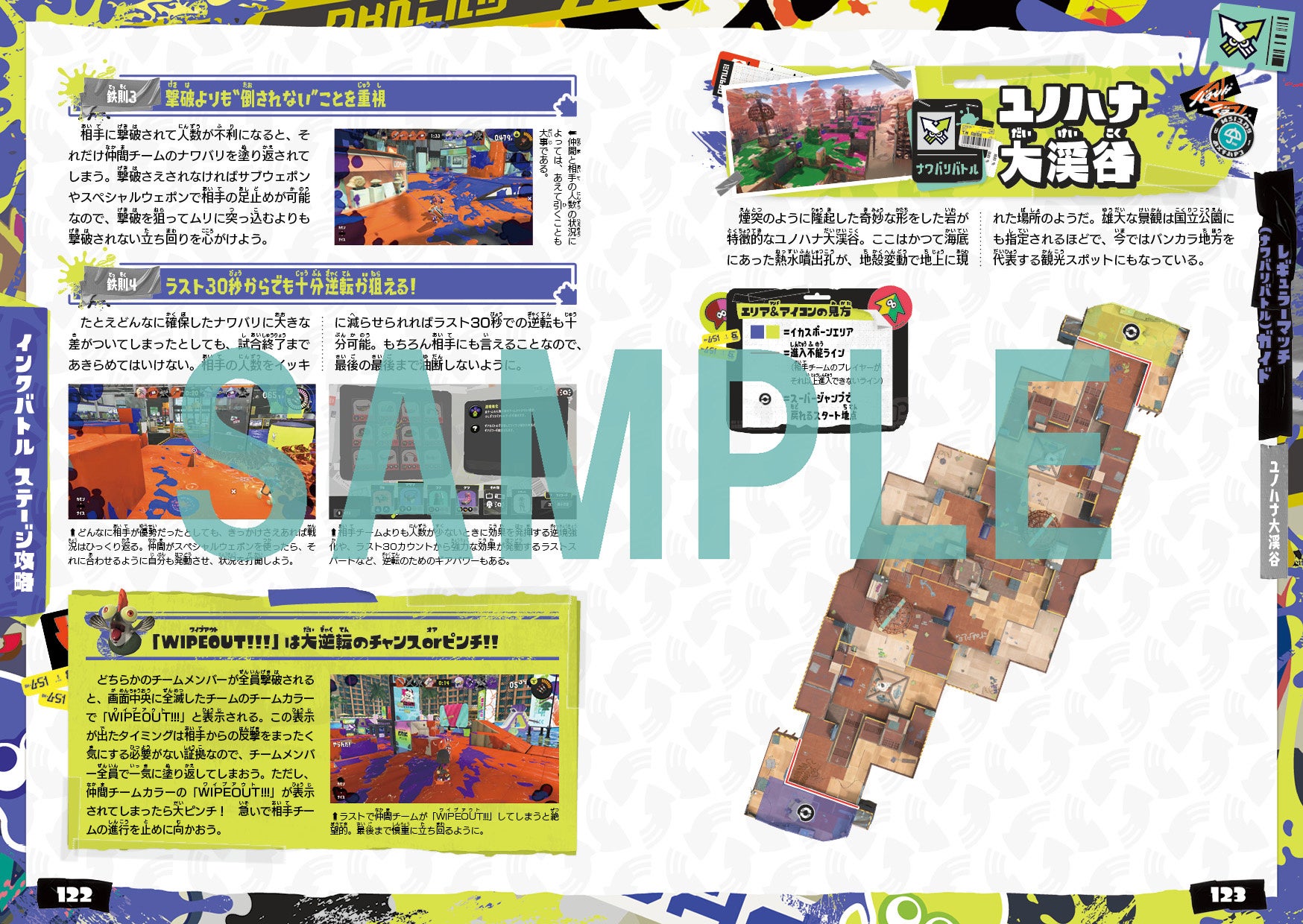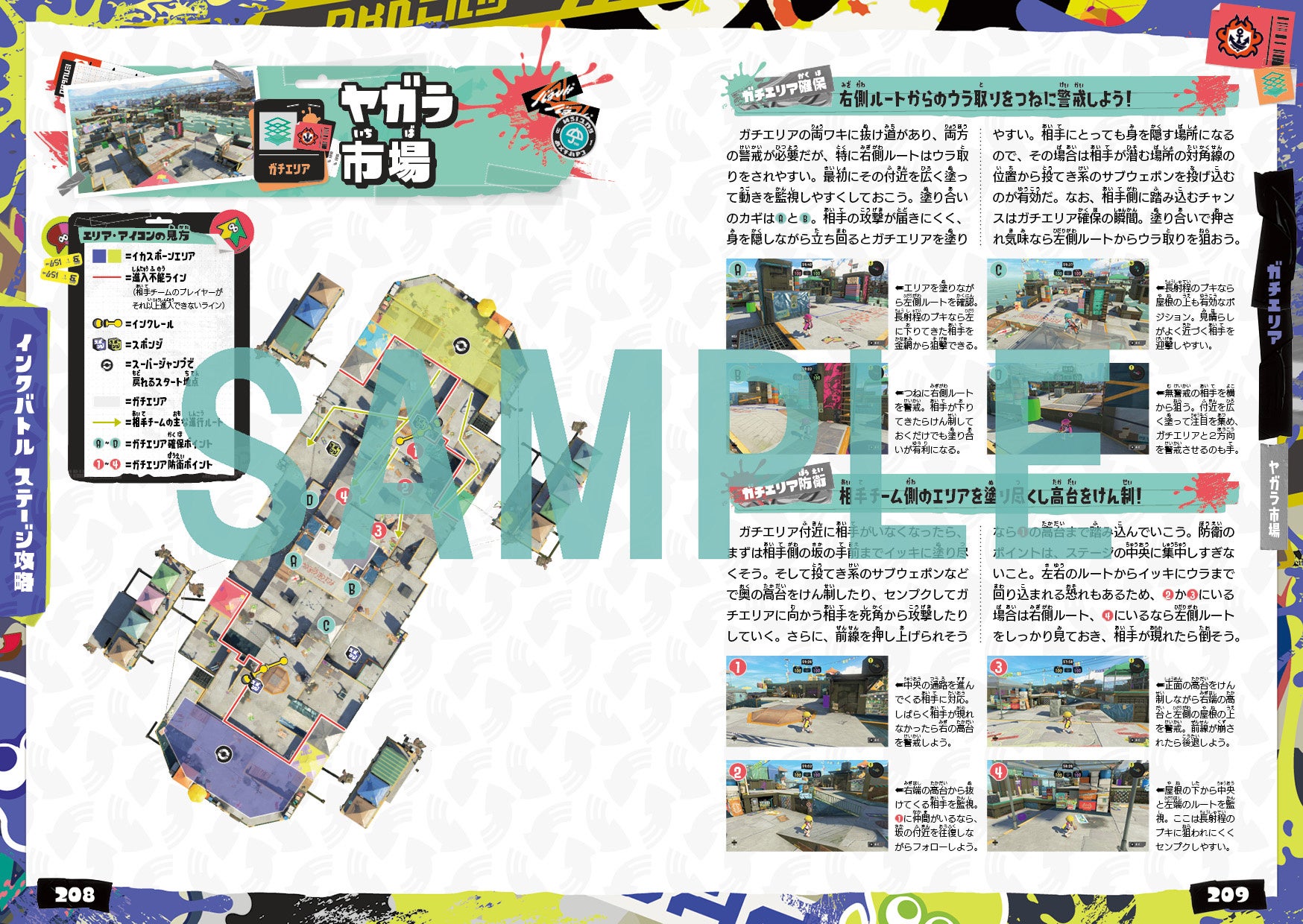 本書のメインとなるインクバトル完全攻略は、ルールごとにすべてのステージのマップを掲載し、チームを勝利に導くための立ち回りや攻略ポイント、防御テクニックにオススメ進行ルートなどをわかりやすく解説しています。