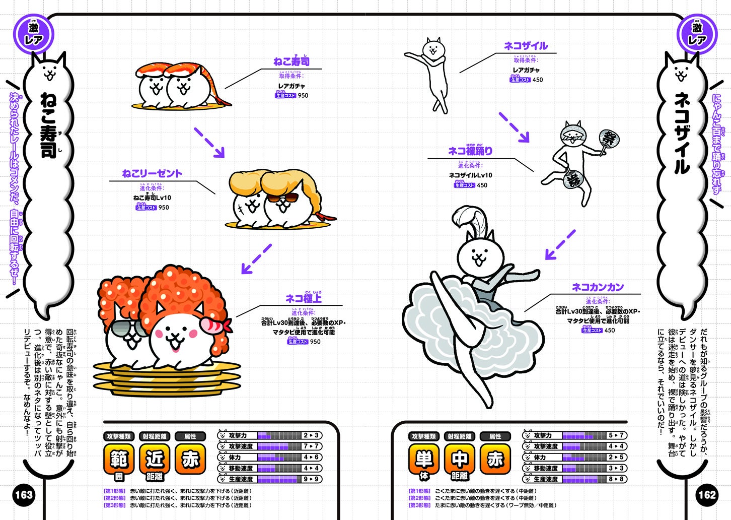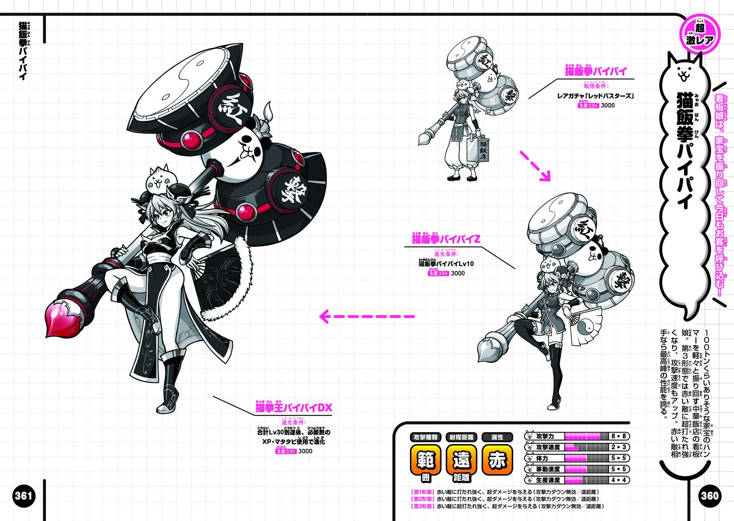 にゃんこたちの最新データがまるまるわかっちゃうお得な一冊。得意な属性、攻撃範囲、射程距離などなど、プレイに役立つ情報がバッチリです。基本から伝説レアまで、いろいろなにゃんこが掲載されているので、新たなお気に入りをさがしてみよう。