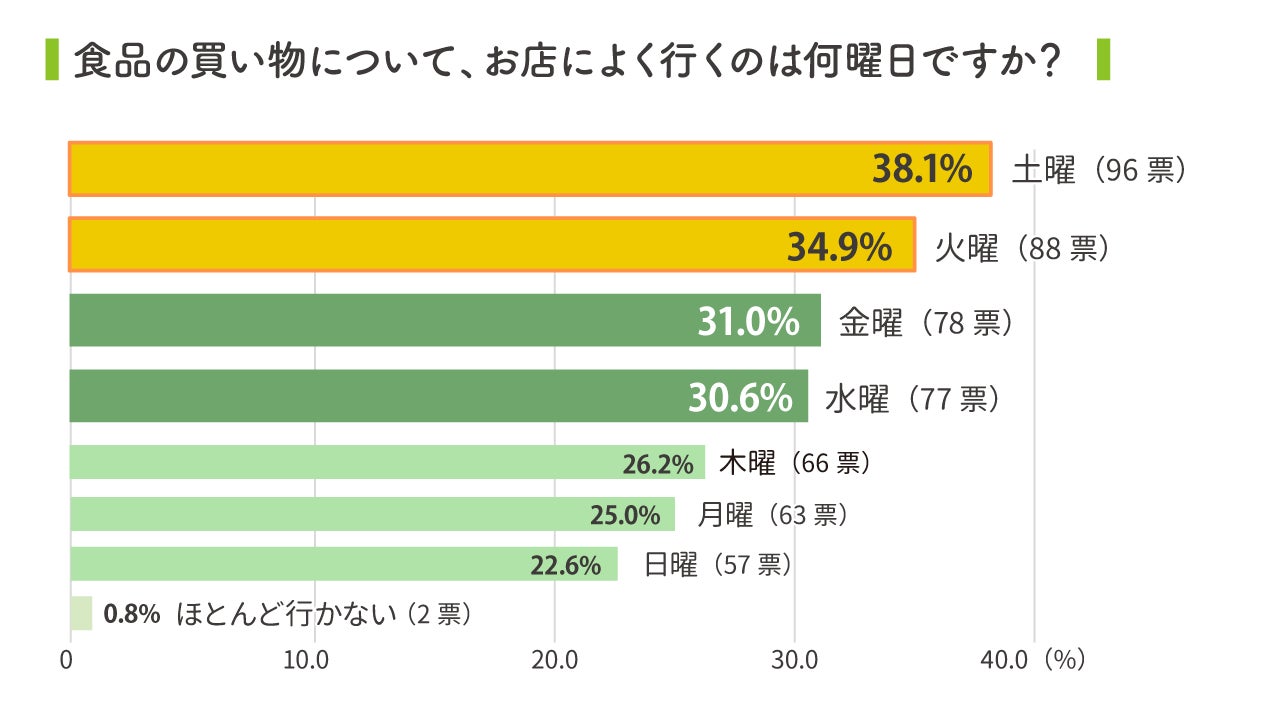 買い物に行く曜日は「土曜」が1番多く、平日を乗り切りホッと一息ついた後の「土曜」にまとめ買いをする方が多いのかもしれません。