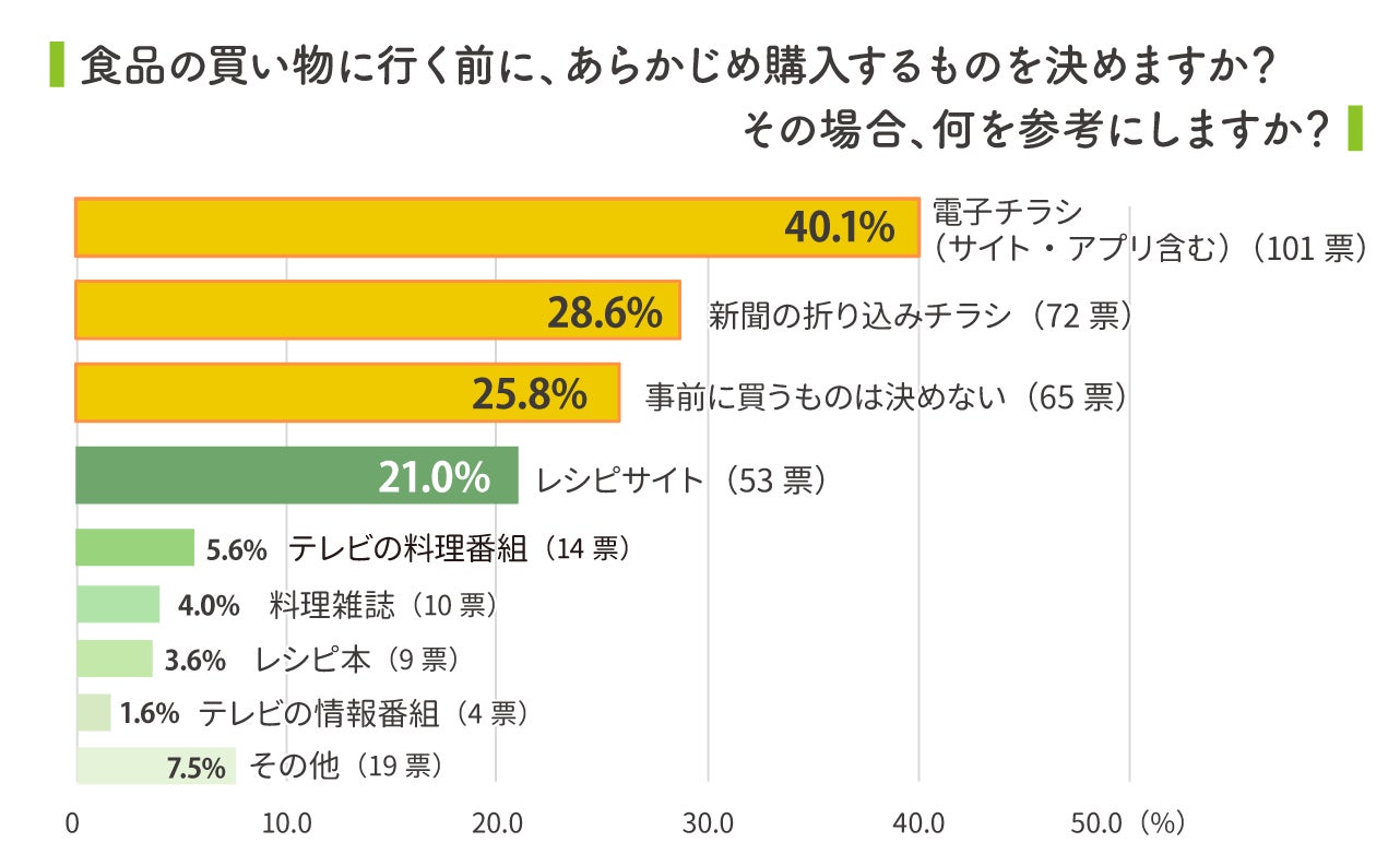 約半数の方が、買い物の前に「チラシ」を見て購入品を決めています。逆に、「事前に買うものは決めない」という方は25.8%という結果に。その日の特売品やオススメ品を把握してから、献立を組み立てているようですね。