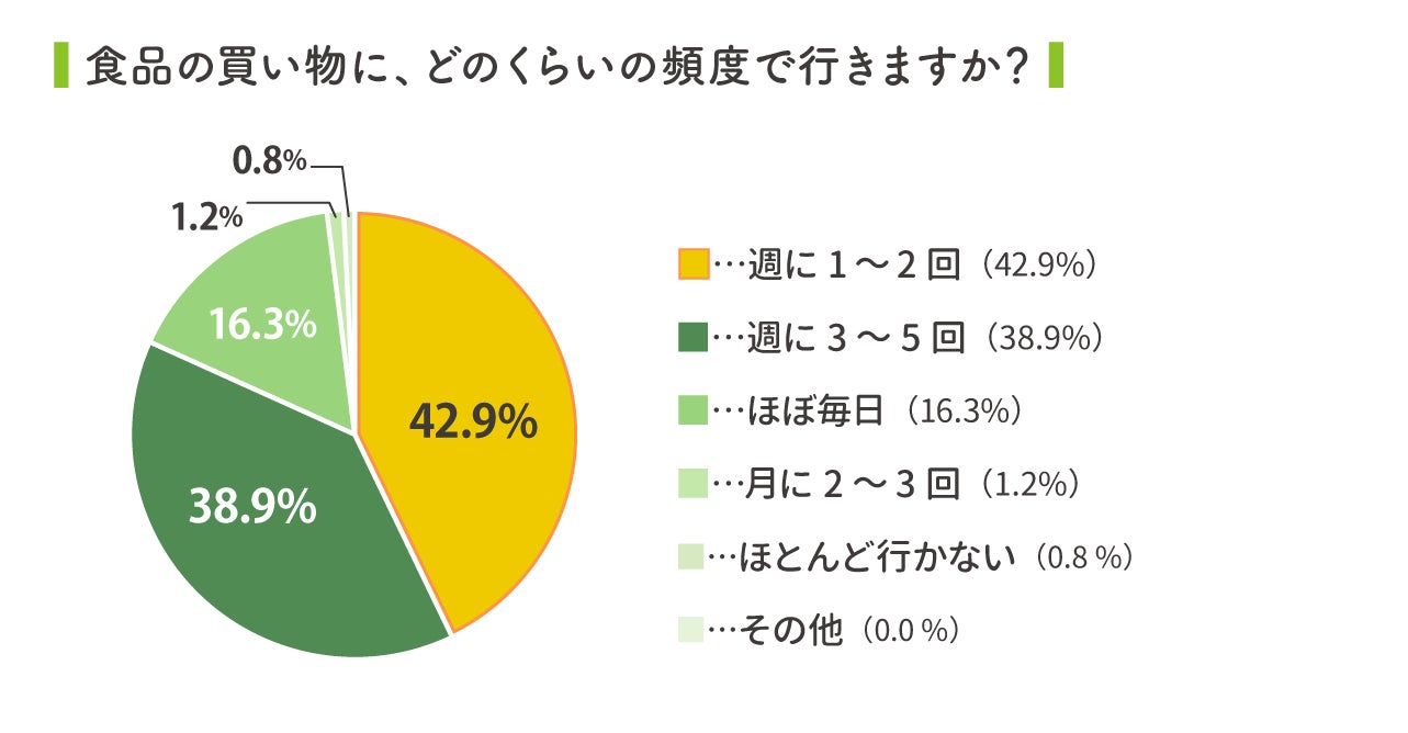 食品の買い物に行く頻度は「週1~2回」が最多。「ほぼ毎日」は16.3%に留まり、多くの回答者が1度で数日分の食材をまとめ買いしていることが分かりました。家事に育児に忙しい子育て中の女性、計画的にまとめ買いをしている様子が伺えます。