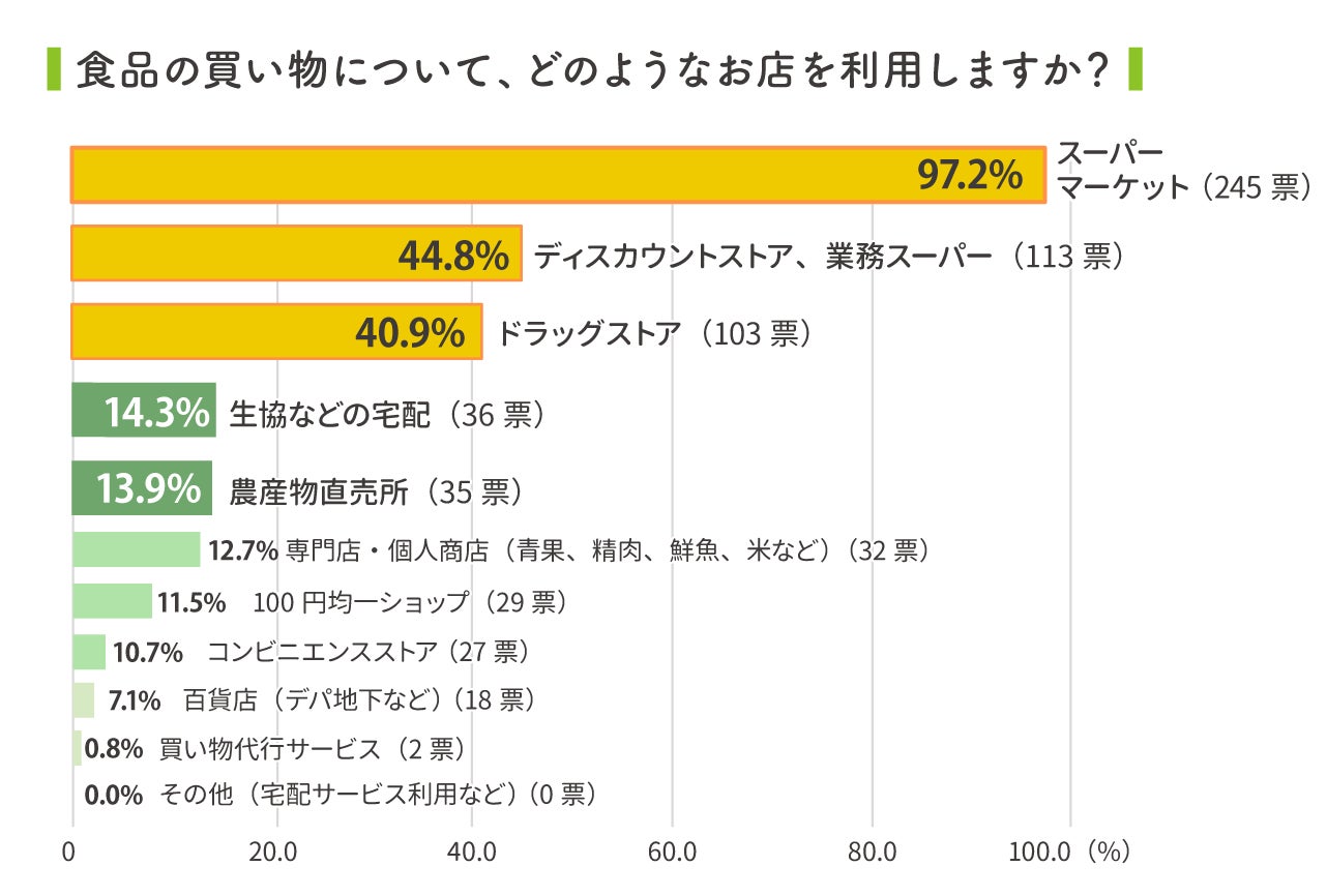 「スーパーマーケット」が97.2%とダントツの1位。 3位にランクインしたのは「ドラッグストア」。最近では、青果や精肉を取り扱う店舗もあり、消費者の人気が集まっています。