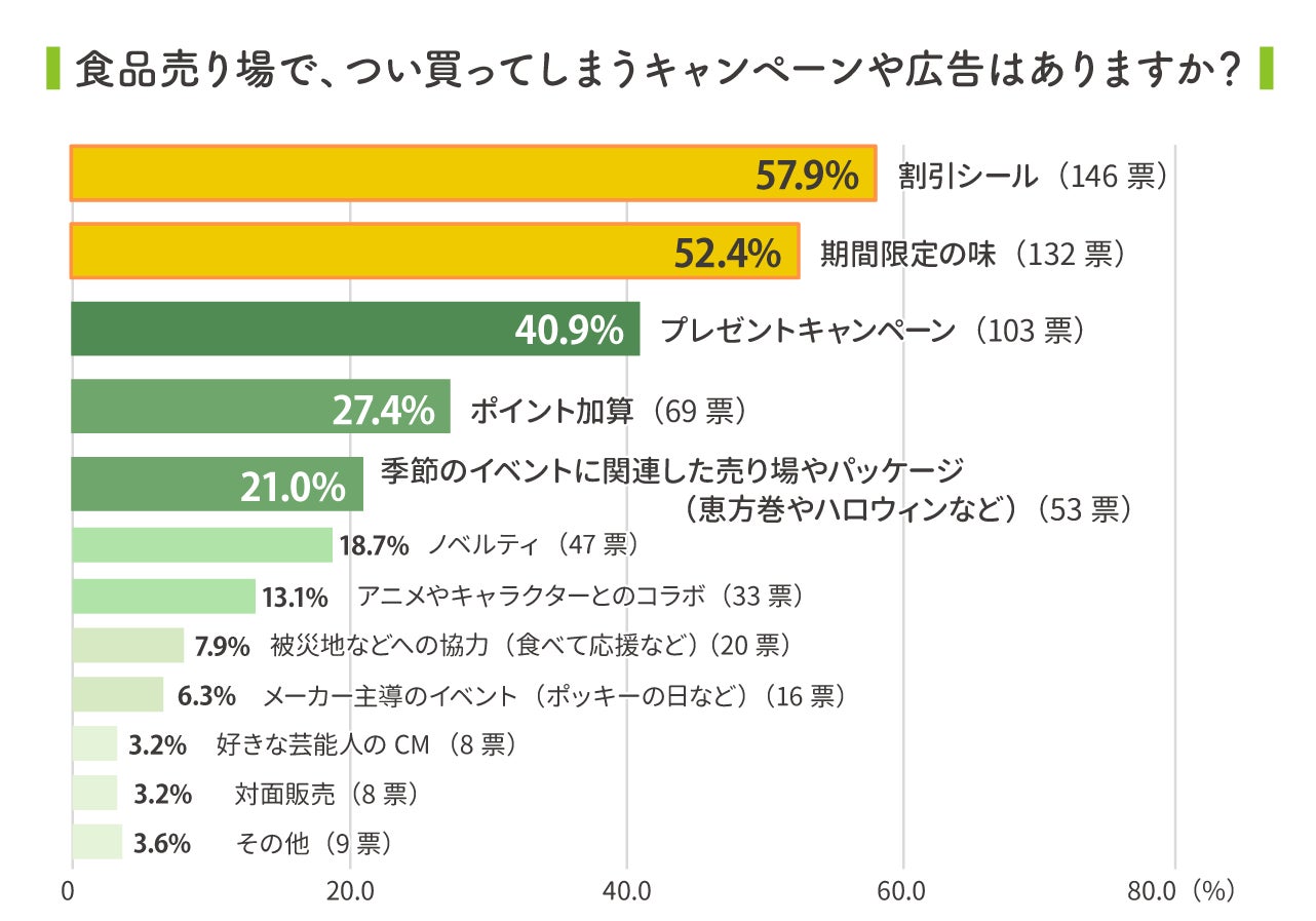 - 食品売り場で、つい買ってしまうキャンペーンや広告はありますか?(n=252、複数回答可)