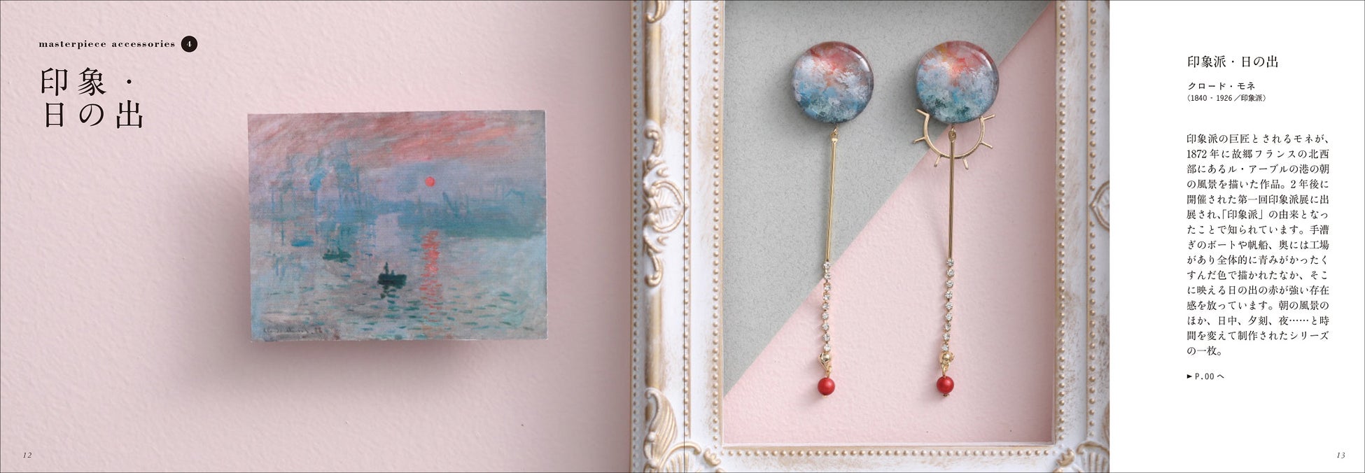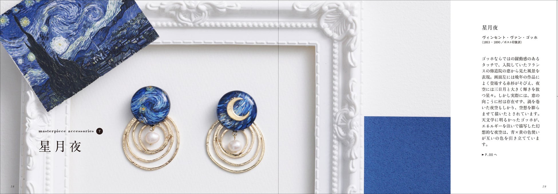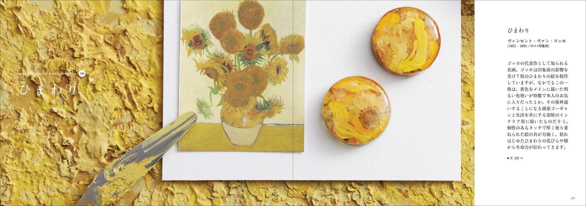 本書はSNSで人気のレジン作家・くまごろ氏が、ゴッホの『星月夜』や『ひまわり』、モネの『印象・日の出』など誰もが知り憧れる名画をモチーフにした、ハンドメイドアクセサリーの作り方を紹介しています。