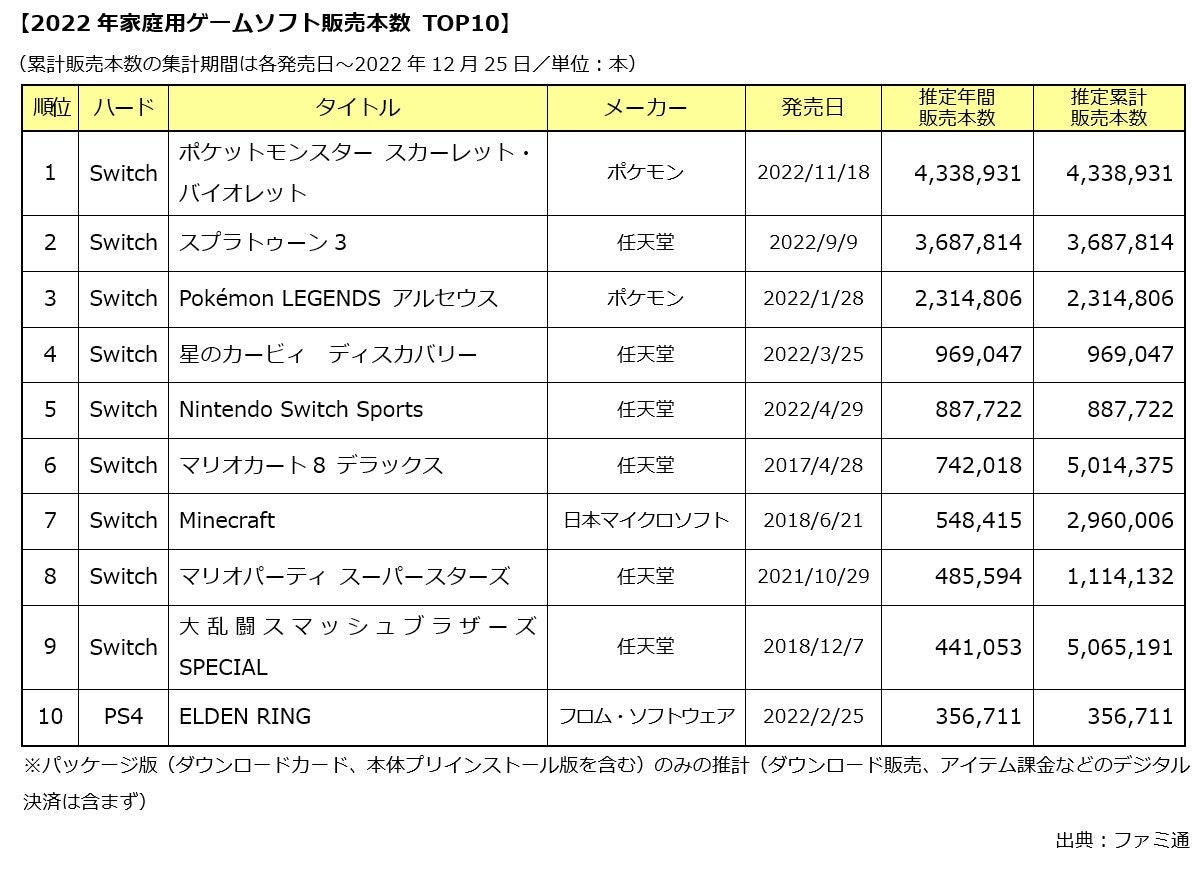 ゲーム総合情報メディア「ファミ通」は、2022年の国内家庭用ゲームソフト(パッケージ版のみ)とハードの売上速報をまとめました。集計期間は2021年12月27日~2022年12月25日です。