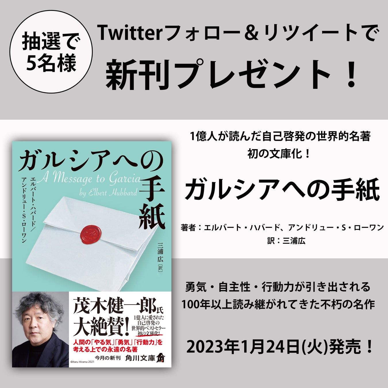 <Twitterプレゼントキャンペーンについて> ・プレゼントキャンペーン名称 『ガルシアへの手紙』プレゼントキャンペーン ・プレゼント賞品 『ガルシアへの手紙』を抽選で5名さまにプレゼント! ・応募方法 (1)TwitterのKADOKAWA翻訳書籍公式アカウント「@kadokawahonyaku」をフォローする (2)注意事項を確認する (3)キャンペーン告知ツイートをRT(リツイート)して、エントリー完了! ・応募しめ切り 2023年1月24日(火)23:59 RT分まで ・当選発表 当選者へのみ2023年1月26日頃、TwitterのDM(ダイレクトメッセージ)で「@kadokawahonyaku」よりお知らせします。 ※あらかじめDMを受け取れるよう設定してください。 ※ご当選の場合、2023年2月2日23時59分までに賞品送付先を専用フォームにてご登録いただく必要があります。かならず期日までにDMをご確認ください。 ・注意事項 ※あらかじめご了承のうえでご応募ください ◎応募には、Twitterへの登録(無料)が必要です。 ◎当選はおひとりにつき1口までとなります。 ◎以下の場合は、応募をお受けできません。 ・第三者の権利を侵害する内容及び公序良俗に反する内容など株式会社KADOKAWA(以下、弊社といいます)で不適切と判断した内容の場合 ・非公開アカウントの場合 ・懸賞応募用アカウントやボット(bot)アカウントから応募した場合 ・当選発表以前に、応募ツイートを削除した場合 ・当選発表以前に、公式アカウントのフォローを解除した場合 ◎応募に際し発生する通信料などは、お客様のご負担となります。 ◎賞品の発送は2023年2月中旬を予定しています。なお、賞品の発送先は日本国内に限ります。 ◎当選賞品を譲渡(転売、オークション出品含む)しないことが応募・当選の条件です。譲渡が明らかになった場合、当選は取り消され賞品をお返しいただく場合があります。 ◎当キャンペーンは、弊社が主催しています。TwitterおよびTwitter社とは関係ありません。 ◎Twitterおよび関連ツールの動作等の不測の障害により、当キャンペーンを予告なく変更・中止させていただく場合があります。 ◎応募に際しご提供いただいた個人情報は、弊社のプライバシーポリシー(https://ir.kadokawa.co.jp/company/privacy_policy.php)の定めるところにより取り扱わせていただきます。 ◎応募に際しお客様に生じた損害等につきましては、弊社に故意・重過失のある場合を除き、弊社は一切賠償の責を負わないものとします。 <キャンペーンについて> KADOKAWAカスタマーサポート https://wwws.kadokawa.co.jp/support/contact/ ※かならずキャンペーン名をご明記ください。 ※サポートは日本国内に限ります。 KADOKAWA翻訳書籍の公式Twitterアカウントはコチラ →https://twitter.com/kadokawahonyaku |