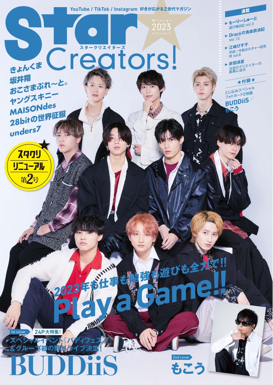 12月に配信シングルを2枚同時リリースし、12/9、10にはLINE CUBE SHIBUYAでのワンマンライブがソールドアウト! 本誌で連載中のもーりーしゅーとも所属している、人気ボーイズグループ・BUDDiiSがスタクリ初の表紙巻頭特集です! アーティスト活動と並行して、バラエティに富んだ動画を配信している彼らの魅力にぐっと迫ります。