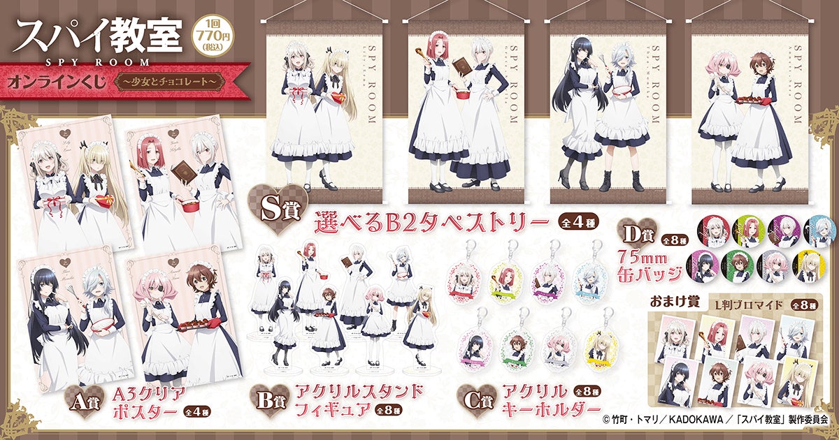 賞品は、一流スパイを目指すリリィたち「灯」の少女8人が勢ぞろいした描き下ろしイラストとなります。少女たち全員でお菓子づくりに挑む、バレンタインデーの季節ならではの愛らしいイラストを使ったオリジナルグッズを多数展開しております。 また期間中に〈リツイートキャンペーン〉として、くじ引き堂のTwitter公式アカウントをフォロー&リツイートすると、抽選で3名様に「D賞 75mm缶バッジ 全8種セット」をプレゼント致します。この機会をお見逃しなく!