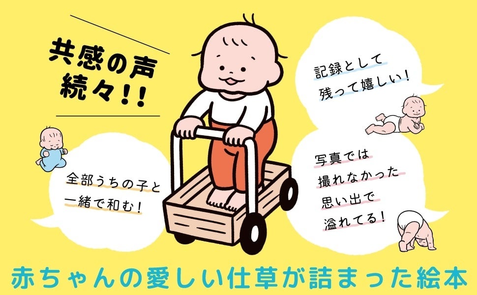 0歳から1歳半までの愛らしいしぐさや思わずニンマリするようなあるあるをぎゅっと凝縮して、大人もこどもも楽しめる一冊になりました。