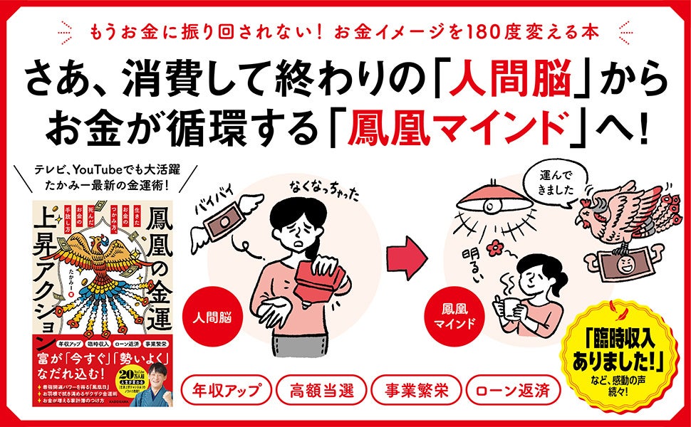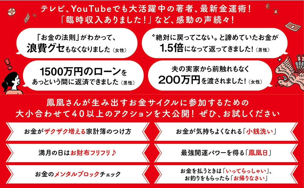 著者の最新金運理論を、大小あわせて40のアクションにしてご紹介。YouTubeなどで発信されたアクションを実際に実践した方から、「臨時収入がありました!」などの感動の声がたくさんあがっています。書籍では、そんな感動の声とともにアクションをわかりやすくご紹介します。