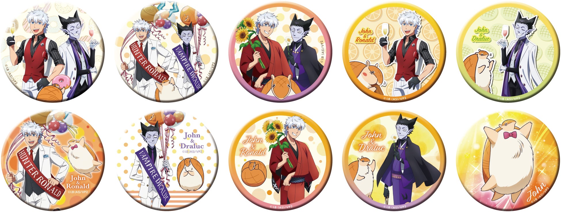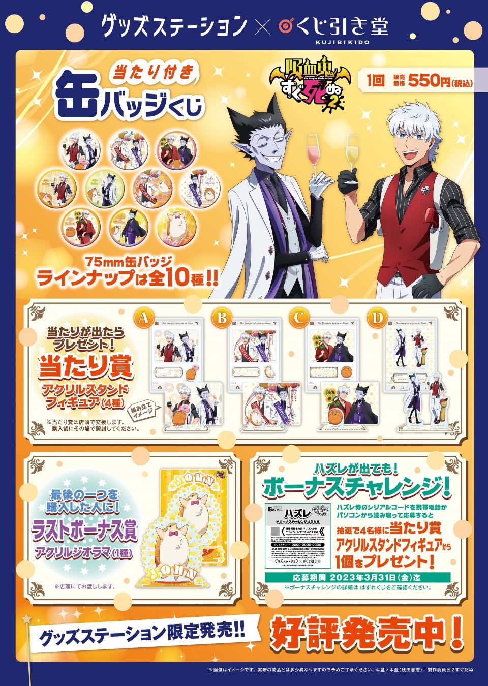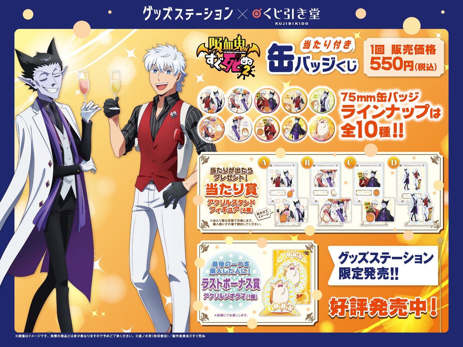グッズステーションで、TVアニメ「吸血鬼すぐ死ぬ2」のロナルドやドラルクの描き下ろしイラストを使用したオリジナル缶バッジを購入頂き、当たり券を引いた方にはアクリルスタンドフィギュアをプレゼント!また、ラスト1個を引いた方にはラストボーナス賞として、アクリルジオラマをプレゼントいたします。
