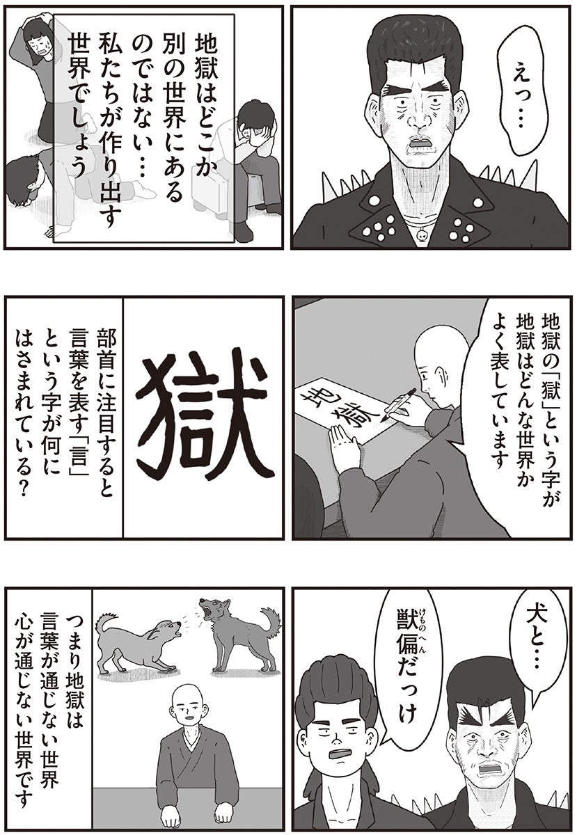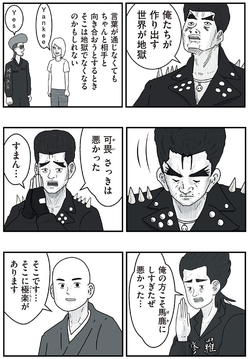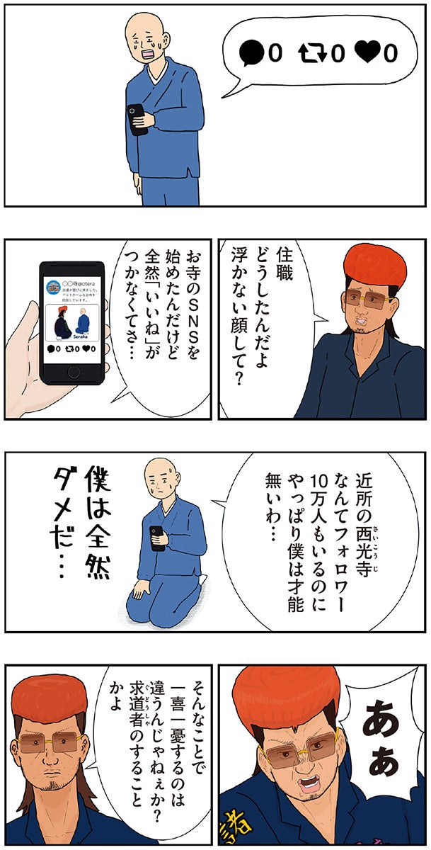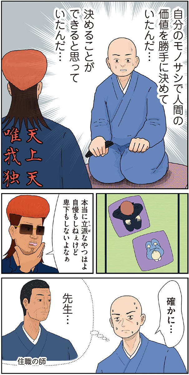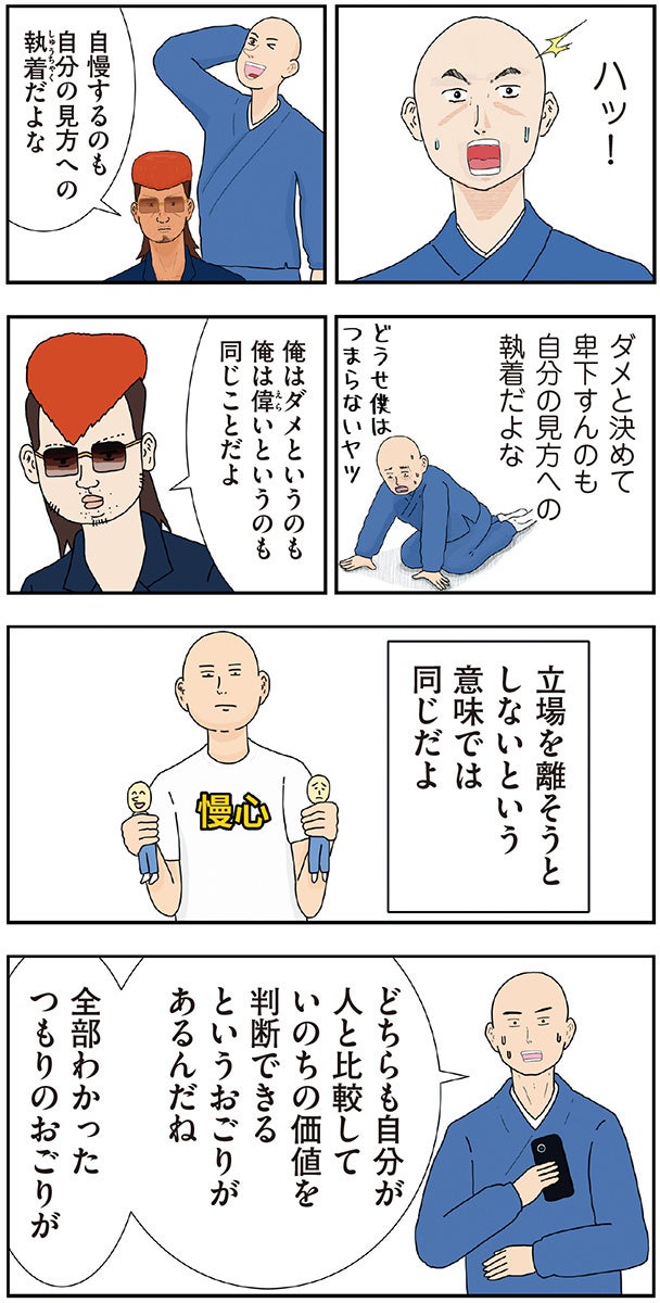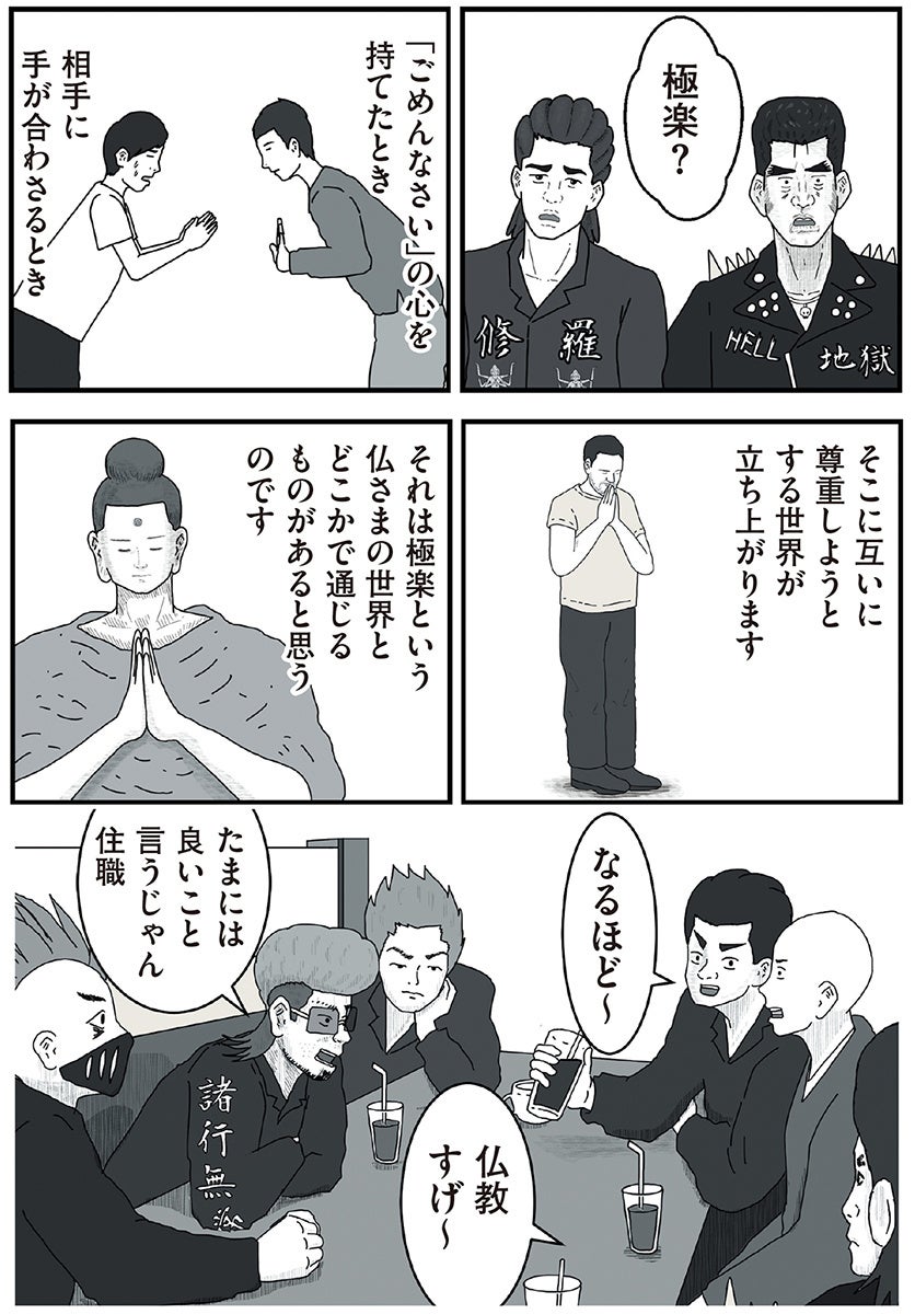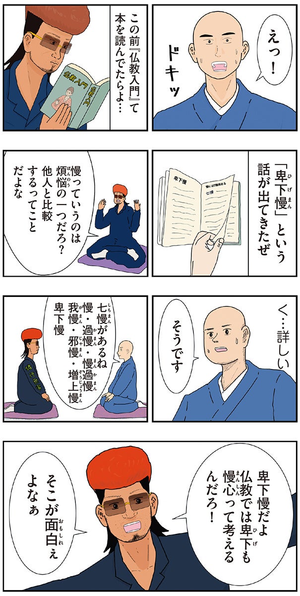 例えば「卑下慢(ひげまん)」の回。「いいね」の少なさを嘆く住職に対し、ヤンキーが「卑下も自分への執着・慢心である」と指摘。難解な仏教用語も、読み進むにつれその成り立ちやおおよその概念が理解できるようになっています。