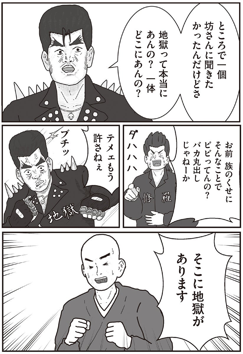 さらに、住職がファミレスでヤンキーの仲間に囲まれたときは、「地獄はどこにあるのか」という問いに対して鮮やかに回答。暴走族も思わず納得してしまいます。