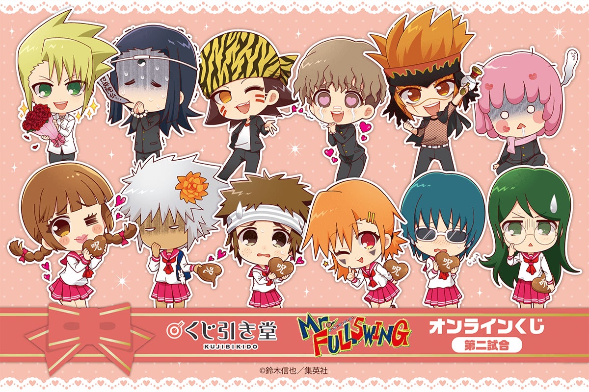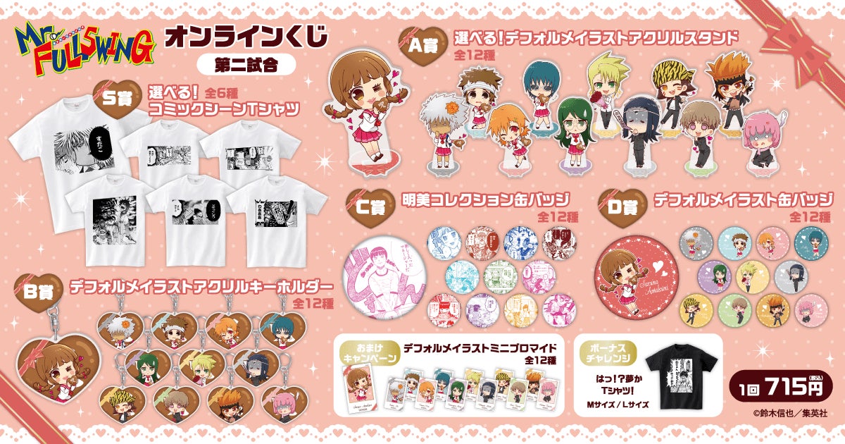 商品はバレンタインデーをテーマに描き起こした、「Mr.FULLSWING」のキャラクターの新規描き起こしデフォルメイラストや、コミックスのコマをデザインしたオリジナルグッズとなります。コミックシーンのTシャツや、缶バッジのほか、バレンタインテーマのスペシャルな絵柄のグッズも盛りだくさん! また期間中に“リツイートキャンペーン”として、くじ引き堂のTwitter公式アカウントの対象ツイートをリツイートすると、抽選で3名様に「D賞 デフォルメイラスト缶バッジ全種セット」をプレゼント!! この機会をお見逃しなく!!