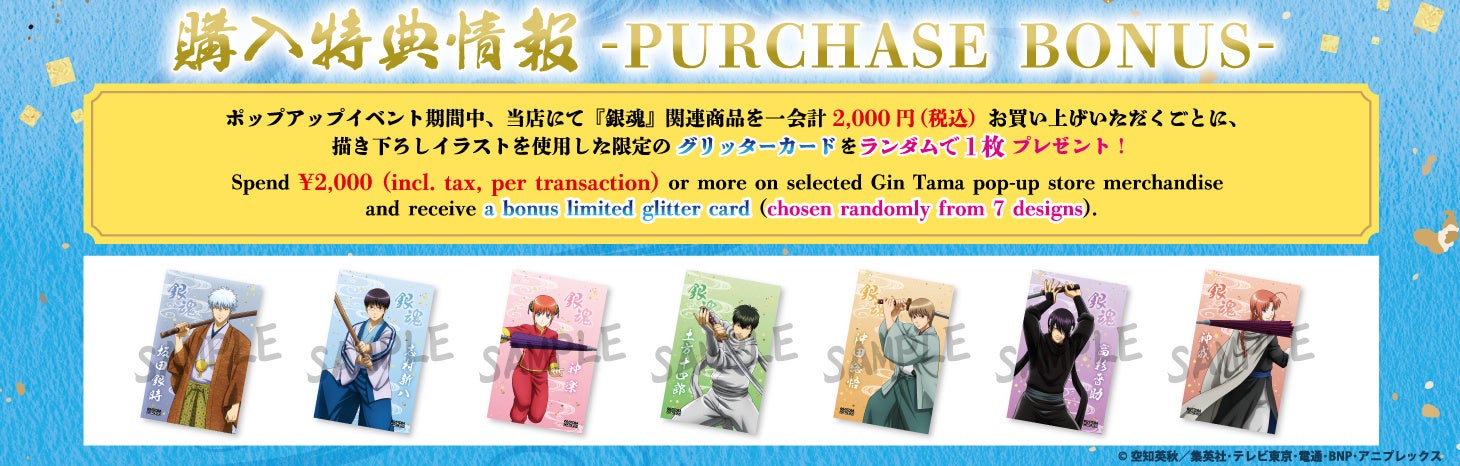 イベント期間中、『銀魂』ポップアップ商品を含む関連商品を2,000円(税込)お買い上げごとに、グッズ購入特典として「限定グリッターカード」(全7種)をランダムで1枚プレゼントいたします。カードは見る角度によってキラキラと光が反射するホログラム仕様です。