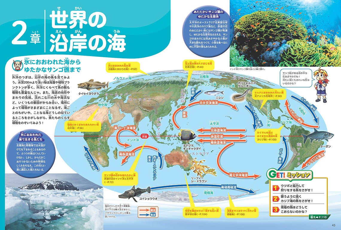 概要:「角川の集める図鑑GET!」は、“考える力を育む”をコンセプトに、KADOKAWAが2021年に創刊した新しい学習図鑑シリーズです。「角川の集める図鑑 GET! 魚」は、キャラクターたちが旅をしながら世界の魚を紹介。美しい生態写真や謎解き要素などが子どもの知的好奇心を喚起し、魚のくらしや進化、さらに環境も含めた知識を体系的に楽しく身につけられる内容となっています。