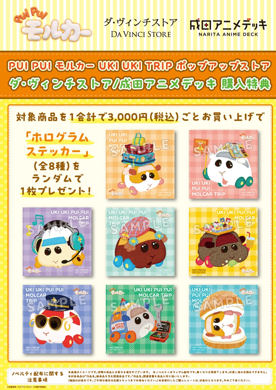 期間中、『PUI PUI モルカー』ポップアップ商品を含む関連商品を3,000円(税込)お買い上げごとに、グッズ購入特典として「ホログラムステッカー」(全8種)をランダムで1枚プレゼントいたします。
