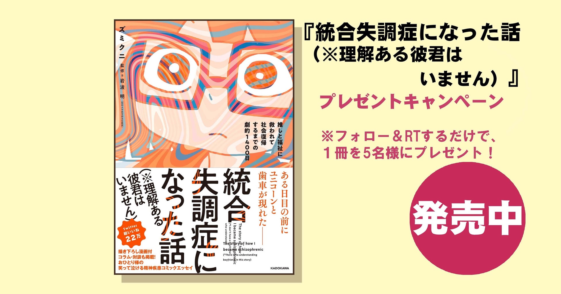 <Twitterプレゼントキャンペーンについて> ・プレゼントキャンペーン名称 『統合失調症になった話(※理解ある彼君はいません)』プレゼントキャンペーン【2023】 ・プレゼント賞品 『統合失調症になった話(※理解ある彼君はいません) 推しと福祉に救われて社会復帰するまでの劇的1400日』1冊を抽選で5名さまにプレゼント! ・応募方法 (1) KADOKAWAノンフィクション(新書NF課)アカウント「@kadokawa_nf」をフォローする。(https://twitter.com/kadokawa_nf) (2)所定のキャンペーンツイートをRT(リツイート)する。 (3)エントリー完了! ※あらかじめ注意事項をご確認のうえでご応募ください。 ・応募しめ切り 2023年3月5日(日)23:59RT分まで ・当選発表 当選者へのみ、2023年3月7日ごろ、Twitterのダイレクトメッセージ(DM)にて「@kadokawa_nf」よりお知らせします。 ※あらかじめDMを受け取れるよう設定してください。※当選の場合、2023年3月14日23時59分までに賞品送付先を登録いただく必要があります。かならず期日までにDMをご確認ください。 ・注意事項 ◎応募には、Twitterへの登録(無料)が必要です。 ◎当選はおひとりにつき1口までとなります。 ◎以下の場合は、応募をお受けできません。 ・非公開アカウントの場合 ・懸賞応募用アカウントやボット(bot)から応募した場合 ・当選発表以前に、応募ツイートを削除した場合 ・当選発表以前に、公式アカウント(@kadokawa_nf)へのフォローを解除した場合 ・第三者の権利を侵害する内容、及び公序良俗に反する内容など、株式会社KADOKAWA(以下、弊社といいます)で不適切と判断した内容の場合 ◎応募に際し発生する通信料などは、お客様のご負担となります。 ◎賞品の発送は2023年3月下旬を予定しています(発送先は日本国内に限ります)。 ◎当選賞品を譲渡(転売、オークション出品含む)しないことが応募・当選の条件です。譲渡が明らかになった場合、当選は取り消され賞品をお返しいただく場合があります。 ◎当キャンペーンは、弊社が主催しています。TwitterおよびTwitter社とは関係ありません。 ◎Twitterおよび関連ツールの動作等の不測の障害により、当キャンペーンを予告なく変更・中止させていただく場合があります。 ◎応募に際しご提供いただいた個人情報は、弊社のプライバシーポリシー(https://group.kadokawa.co.jp/privacy_policy/main.html)の定めるところにより取り扱わせていただきます。 ◎応募に際しお客様に生じた損害等につきましては、弊社に重過失のある場合を除き、弊社は一切賠償の責を負わないものとします。 KADOKAWAノンフィクション(新書NF課)の公式Twitterアカウントはコチラ →https://twitter.com/kadokawa_nf <キャンペーンについて> KADOKAWA カスタマーサポート https://wwws.kadokawa.co.jp/support/contact/ ※かならず「『統合失調症になった話』プレゼントについて」とご明記ください。 ※サポートは日本国内に限ります。 |