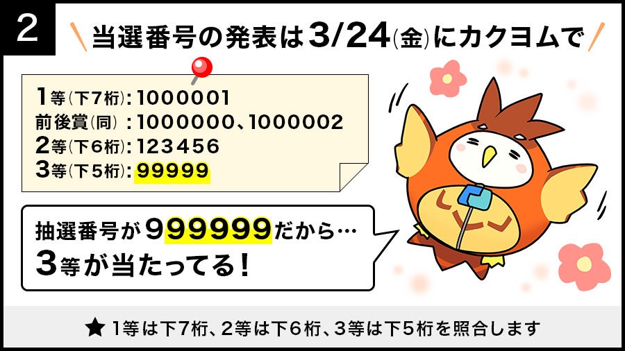※それぞれの賞で、抽選番号の指定部分が当選番号と同じだった方が当選となります。