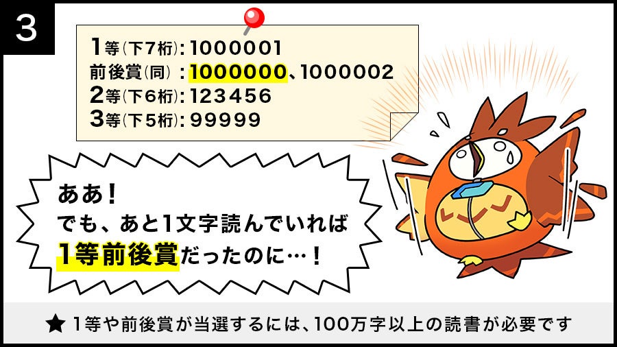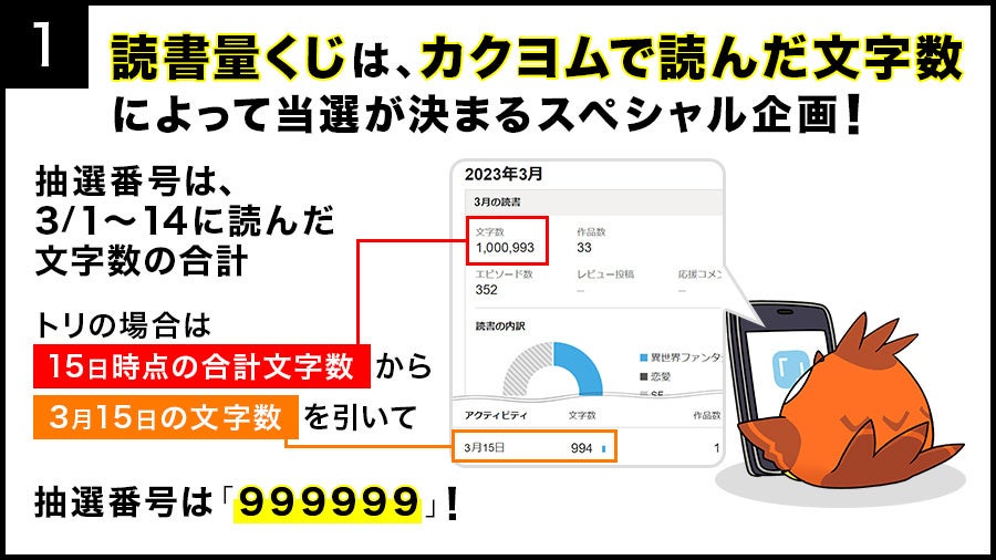 「読書量くじ」は、カクヨムの読書データで確認できる、「カクヨムで読んだ文字数の合計」を使ったスペシャル企画です。