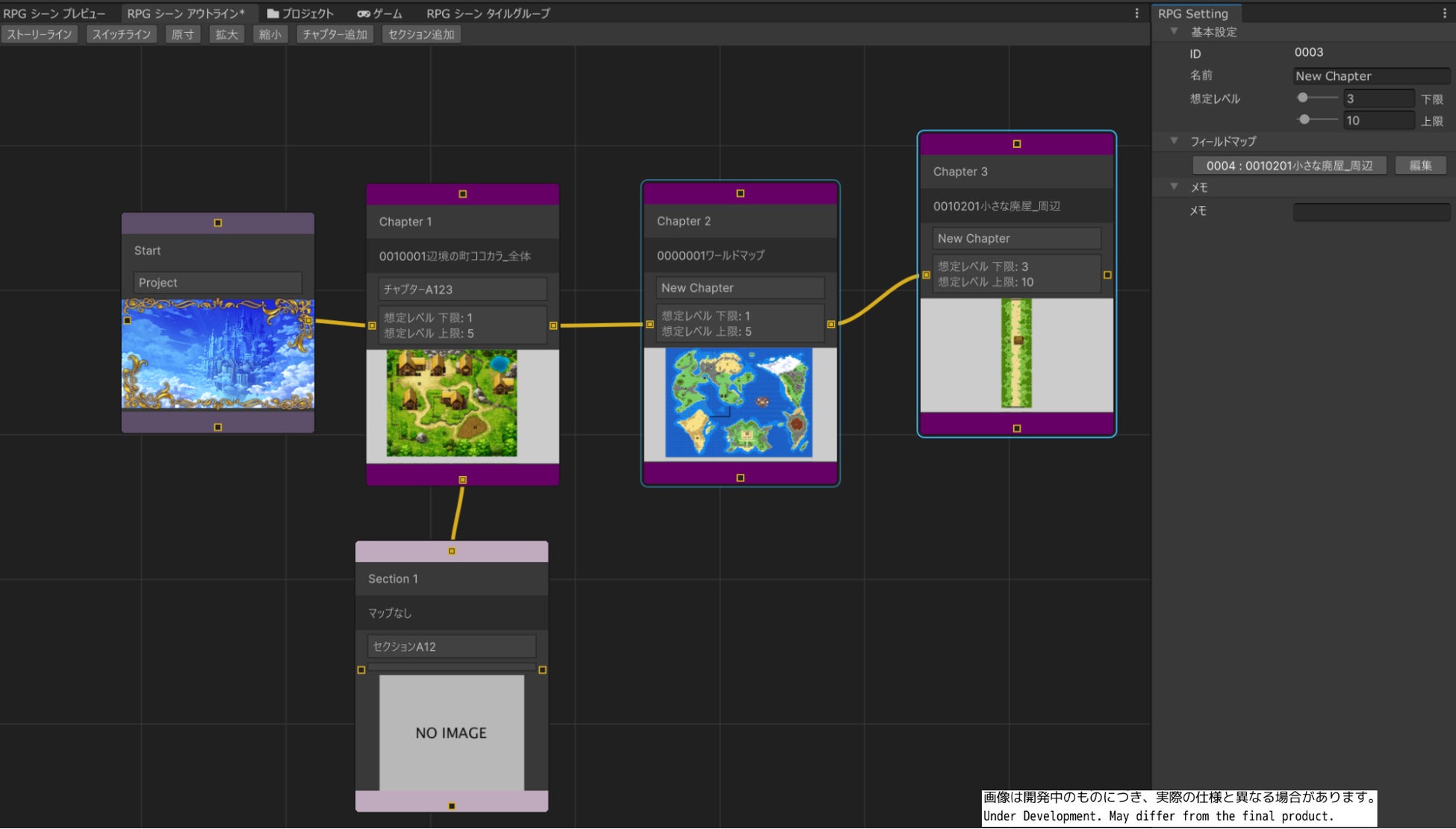 ゲームのストーリー進行部分とイベントの繋がりを図形化(アウトライン化)して管理できるようにするための制作支援機能になります。