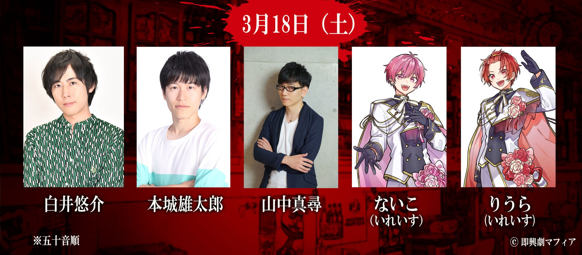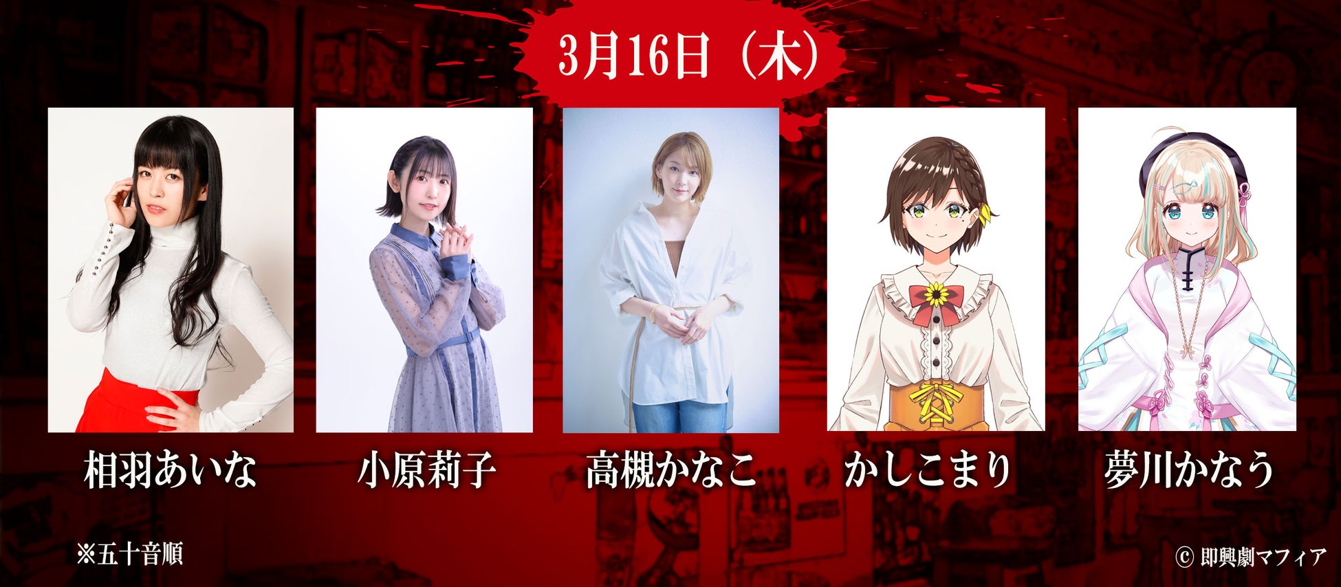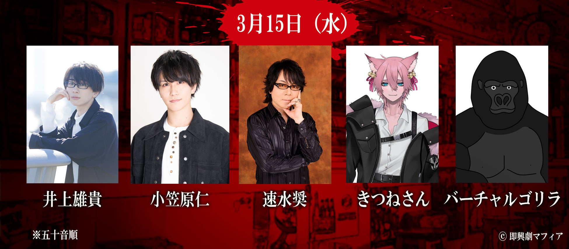 声優、VTuberの豪華出演陣がアドリブでお芝居をしながら、マフィアのボスの死の真相解明に挑みます。どんな展開が待ち受けているか、誰もが予測不能な即興劇をお楽しみください!