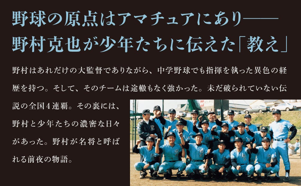 『夏を赦す』『詰むや、詰まざるや』などこれまで多くの野球系ノンフィクションを上梓してきた長谷川晶一氏の最新作。プロ野球の大監督である野村克也氏が、中学野球「港東ムース」で指揮を執った異色の経歴をたどる。このチームは途轍もなく強く、未だ破られていない伝説の全国4連覇の記録を持つ。さらに、このチームには古田敦也よりも先に野村の薫陶を受けた一人の捕手がいた――。野村克則、井端弘和、G.G.佐藤、団野村、ケニー野村等……関係者の証言から野村と少年たちの濃密な日々を綴る渾身のノンフィクション。