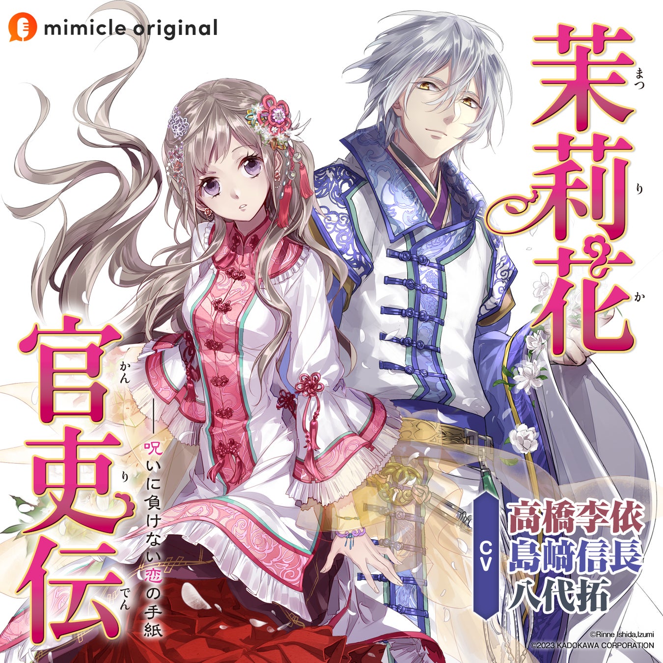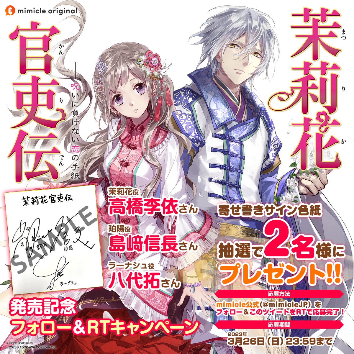 『茉莉花官吏伝 呪いに負けない恋の手紙』の発売を記念してフォロー&RTキャンペーンを開催。キャンペーン期間中にmimicle公式(@mimicleJP)をフォローしたうえでキャンペーンツイートをリツイートすれば応募完了となります。抽選で2名様に「出演声優陣(高橋李依さん/島﨑信長さん/八代拓さん)の寄せ書きサイン色紙」をプレゼントいたします。