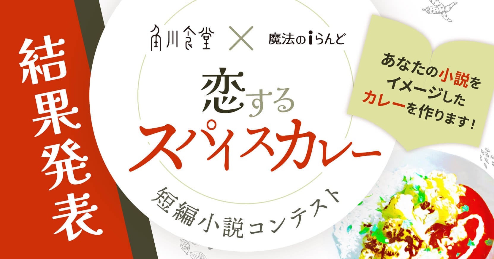 多数の女性作家が活動する魔法のiらんどならではの切ない・ほっこり・笑える 4つの受賞作が決定しました。受賞作の選定からメニュー化までを角川食堂が行い、作品の世界観をカレーで表現しました。見て、食べて、さらに読んで楽しいオリジナルカレーは2023年3月25日~4月23日の期間で、角川食堂にてメニュー販売いたします。期間中オリジナルカレーをご注文いただいたお客様には、 本企画限定リーフレットを配布いたします。リーフレットには受賞作の一部を掲載しており、リーフレット上の二次元コードから魔法のiらんどサイトへアクセスいただくと全文を無料でお読みいただけます。
