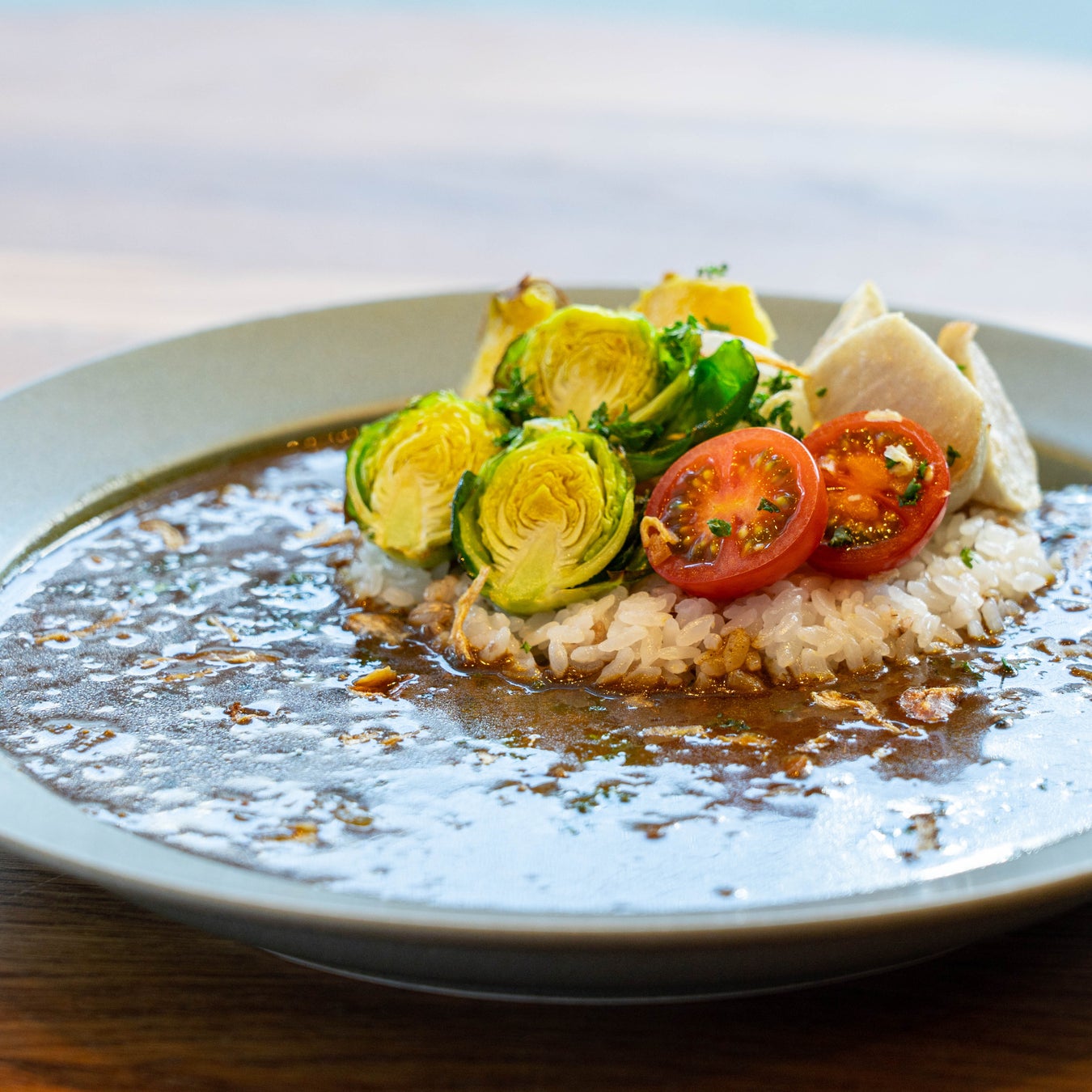 ハンバーグ専門店の裏メニューという想像の元、作品には描写のなかったハンバーグをトッピング。また、ハンバーグ屋のカレーという設定を生かし、洋食で使われるフォン・ド・ヴォー系をベースに仕上げました。