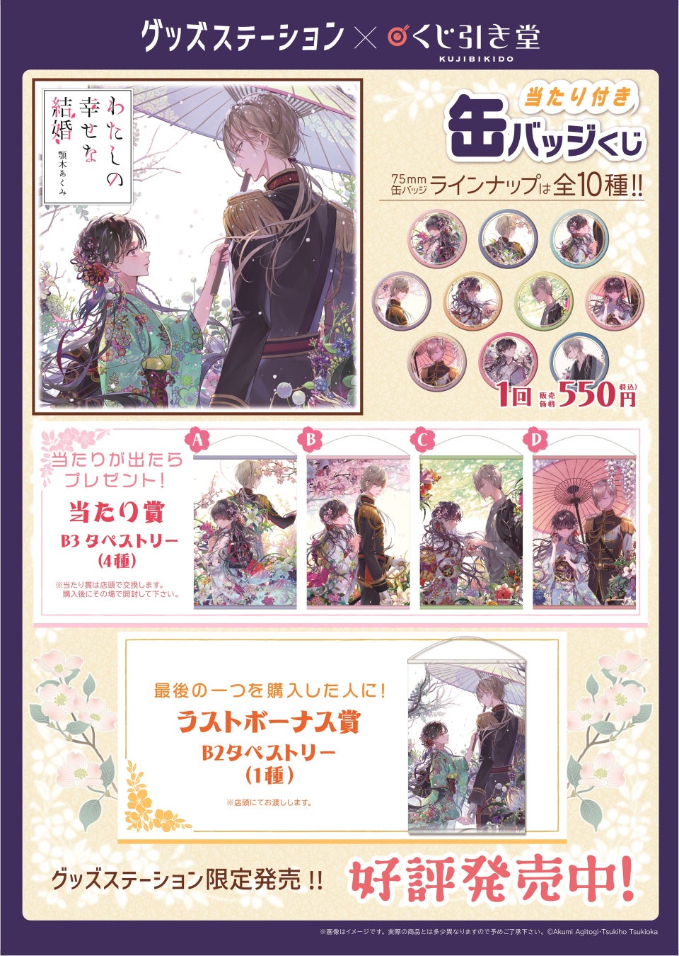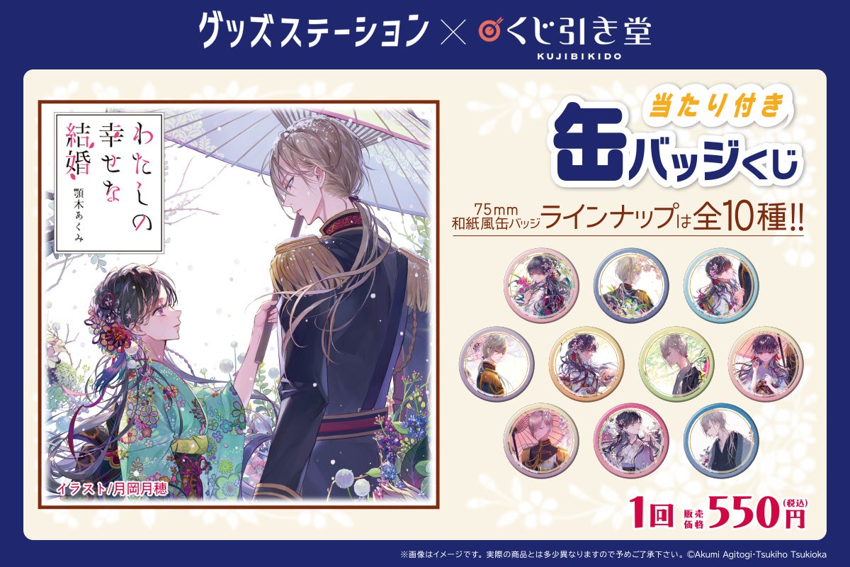 グッズステーションでは、小説「わたしの幸せな結婚」の美世と清霞のイラストを使用した“抽選くじ付き”のオリジナル缶バッジを販売。ご購入頂いた方の中から、当たり券を引いた方にB3タペストリーをプレゼントいたします。また、ラスト1個を引いた方にはラストボーナス賞としてB2タペストリーをプレゼント!! 是非、この機会をお見逃しなく!!