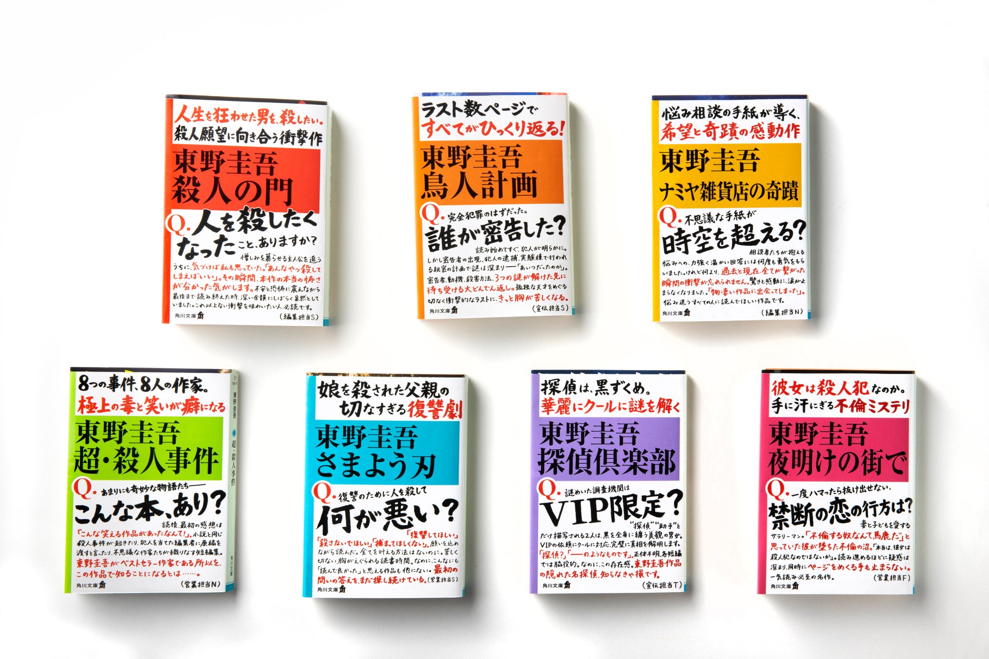 さらに、著作100作到達を記念し、角川文庫既刊7作品を新たにデザインした「超幅広帯」仕様で、全国の一部書店で展開中です。対象作品は、『鳥人計画』『探偵倶楽部』『殺人の門』『さまよう刃』『夜明けの街で』『ナミヤ雑貨店の奇蹟』『超・殺人事件』です。各作品への手書きの推しコメントが全面にデザインされた7色の印象的な新帯が完成しました。書店店頭では、既存のカバーの上に巻かれて登場します。編集、営業、宣伝各担当者の熱い推薦コメントは要チェックです。こちらもぜひご覧いただき、お気に入りの1冊を見つけてください。