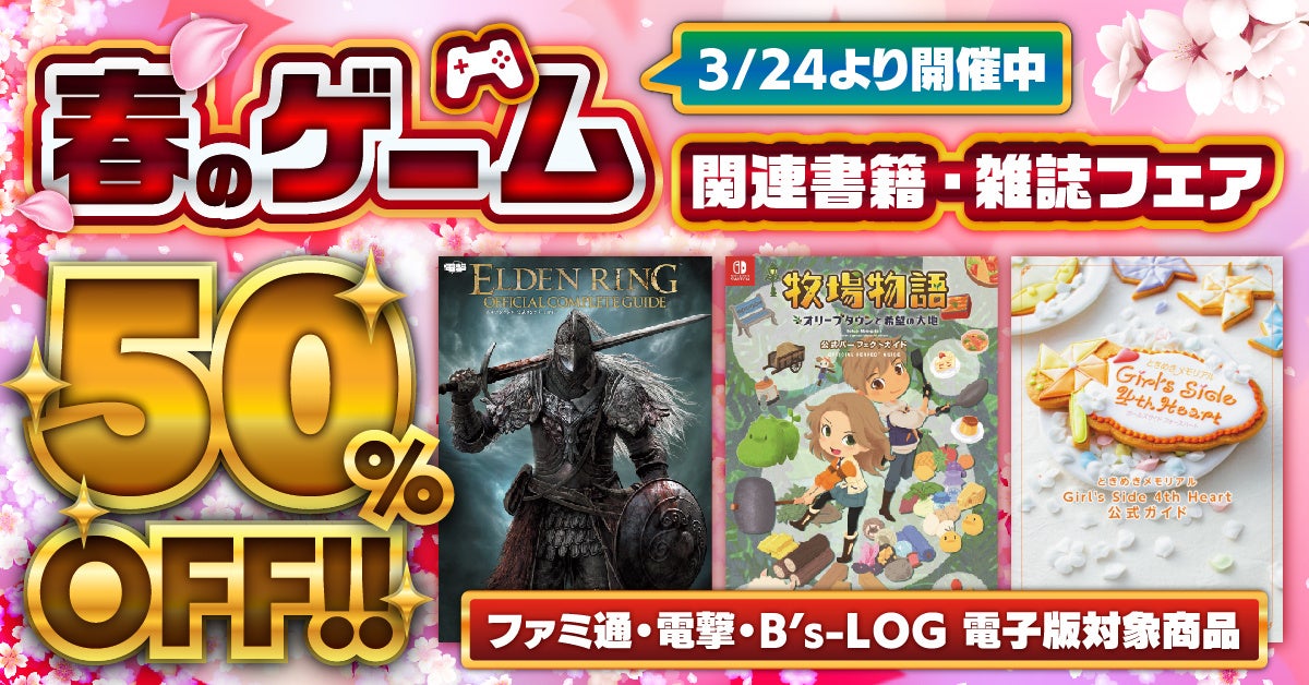 「ファミ通」「ゲームの電撃」「B's-LOG(ビーズログ)」の各レーベルの電子書籍が50%オフで購入できる春のゲーム関連書籍・雑誌フェアが開催中です。さまざまなゲーム攻略本やアートブック、設定資料集などが大変お求めやすい価格で購入出来るチャンスです。週刊ファミ通、B's-LOGなどの雑誌についてもバックナンバーが割引セール中。この機会にぜひチェックしてみてください!