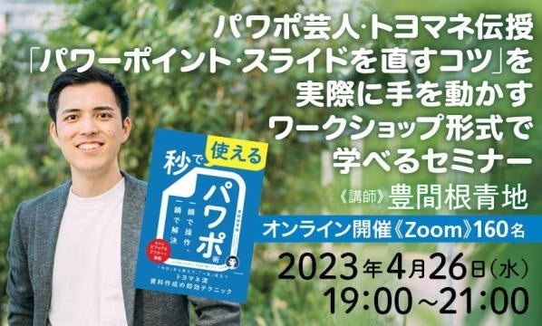 本書の発売を記念して、4月26日(水)に、著者の豊間根青地氏によるオンライン・イベントを行います。みなさんからの「パワーポイントで資料を作成しても、どうもカッコよくわかりやすくならない……」といったお悩みを、トヨマネさんと一緒にワークショップ形式で解消しましょう。使うのは、『秒で使えるパワポ術』の巻末にも「宿題」として掲載されている3つのスライド。解説・講義の後で、参加者のみなさんには、3つのうち1つのスライドを選んでいただき、実際に手元で直す作業をする時間を設けます。その後、「添削あり」のプランでご参加の方(10名限定)にはスライドを提出いただき、トヨマネさんが直接添削。「イケてないパワポ」をブラッシュアップするにはどうするのか?――「講義 → ワーク → 添削・講評」の充実120分です!