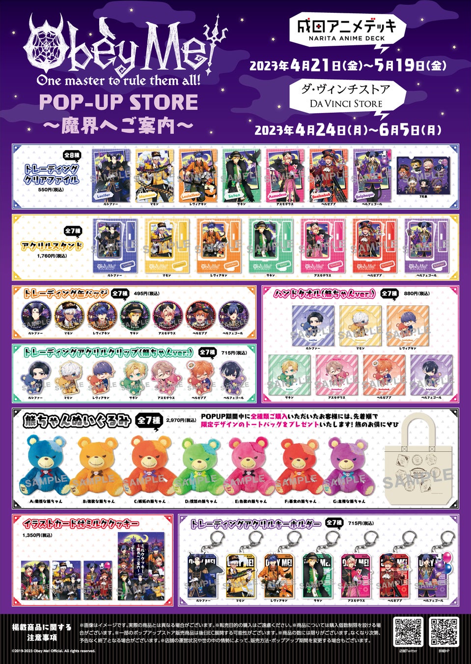 イベント期間中、店頭にて『Obey Me!』ポップアップ商品を含む関連商品を4,000円(税込)お買い上げごとに、グッズ購入特典として録り下ろし「おやすみボイスカード」(全7種)をランダムで1枚プレゼントします。7兄弟があなたに語りかけるボイスは、毎晩聞きたくなること間違いなし!