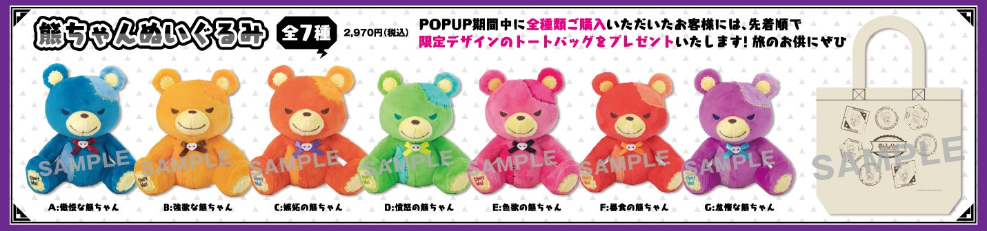 ポップアップ期間中に7体セットでご購入いただくと、「Obey Me!魔界ツアートートバッグ」をプレゼントいたします(先着順・数量限定)。パスポートのスタンプをイメージした限定デザインに、熊ちゃんぬいぐるみ7体が全部入るビッグサイズのトートバッグで、ぬいぐるみたちとのお出かけにもぴったり。