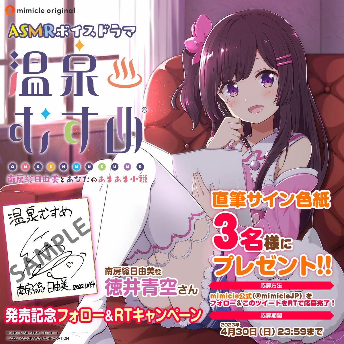 『ASMRボイスドラマ 温泉むすめ 南房総日由美とあなたのあまあま小説』の発売を記念してフォロー&RTキャンペーンを開催。キャンペーン期間中にmimicle公式Twitter(@mimicleJP)をフォローしたうえでキャンペーンツイートをリツイートすれば応募完了となります。抽選で3名様に「南房総日由美役 徳井青空さん直筆サイン色紙」をプレゼントいたします。