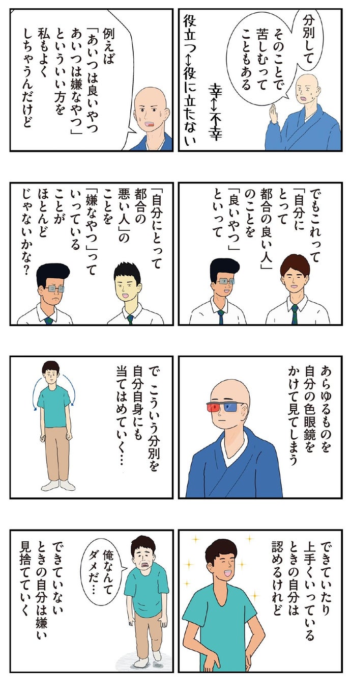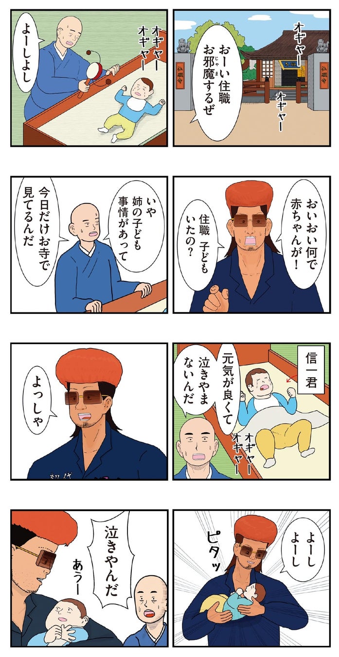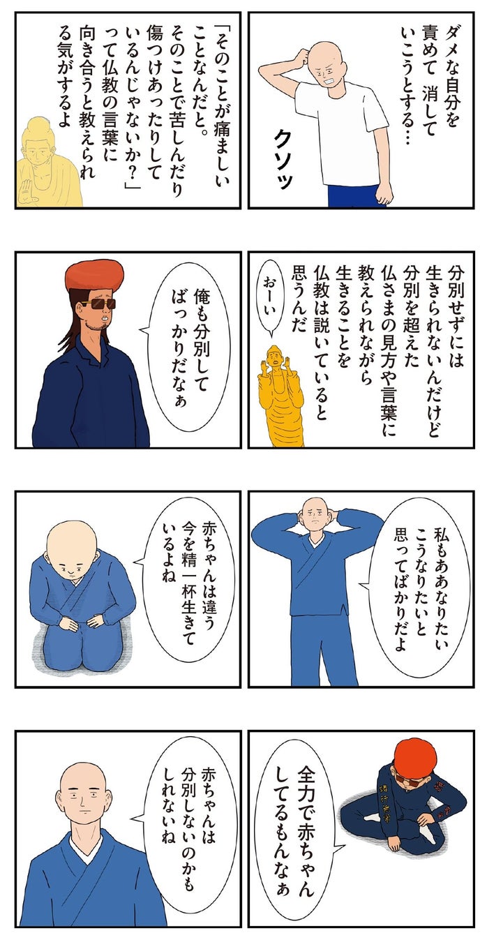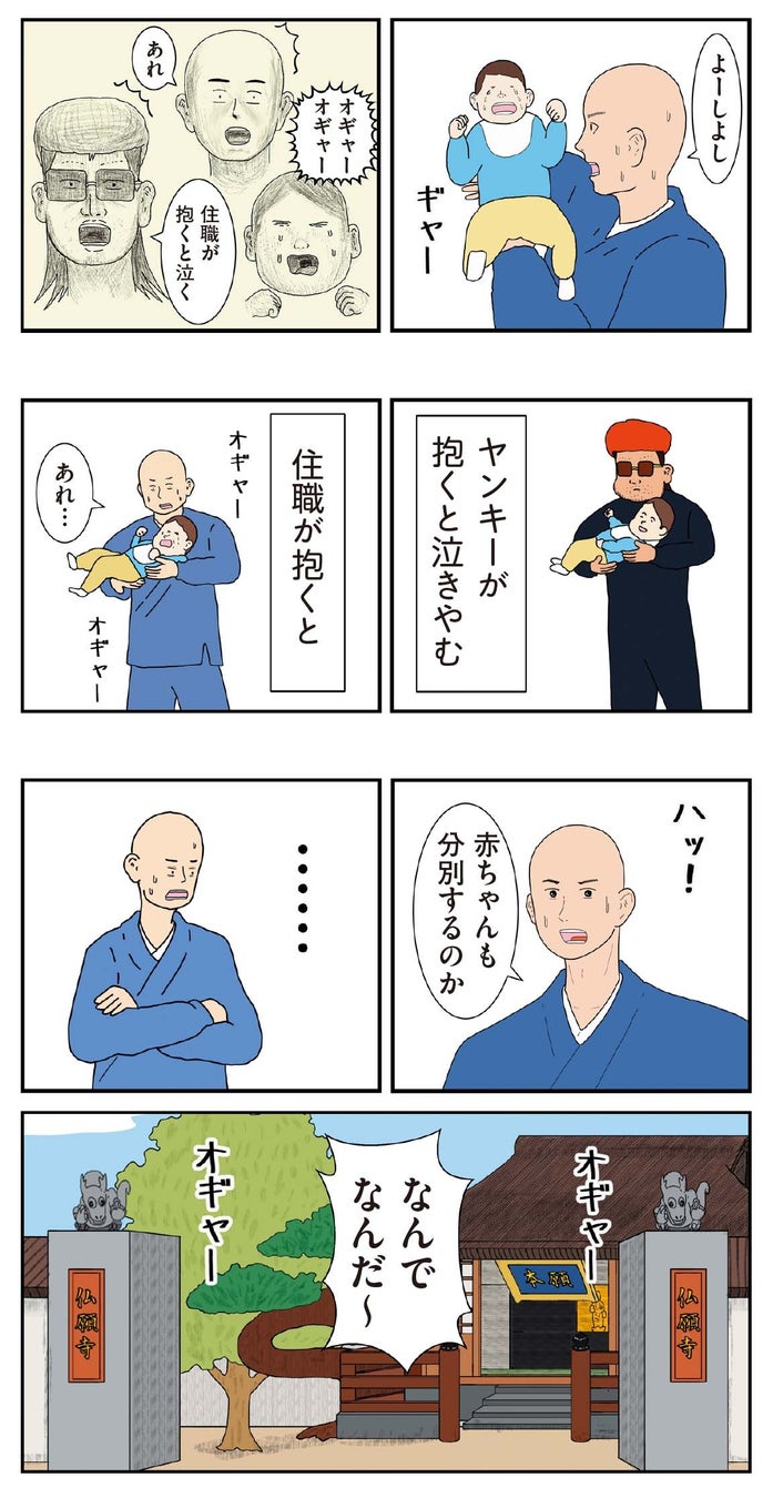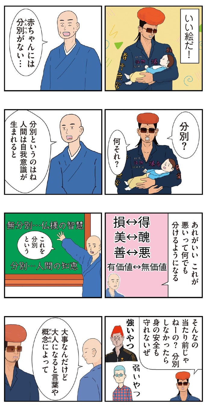 漫画の中から一例として「分別(ふんべつ)」の回を紹介します。こわもてのヤンキーに抱かれて泣き止んだ赤ちゃんを見て、住職は「赤ちゃんには分別がない…」とつぶやきます。「分別」とは、自我が芽生えるにつれ色眼鏡で物事を判断するようになってしまうこと。分別することによって余計な苦しみが生まれるのではないかという仏教の言葉に、考え込む2人。このように、難解な仏教用語の成り立ちやおおよその概念が、エピソードを通じて理解できるようになっています。