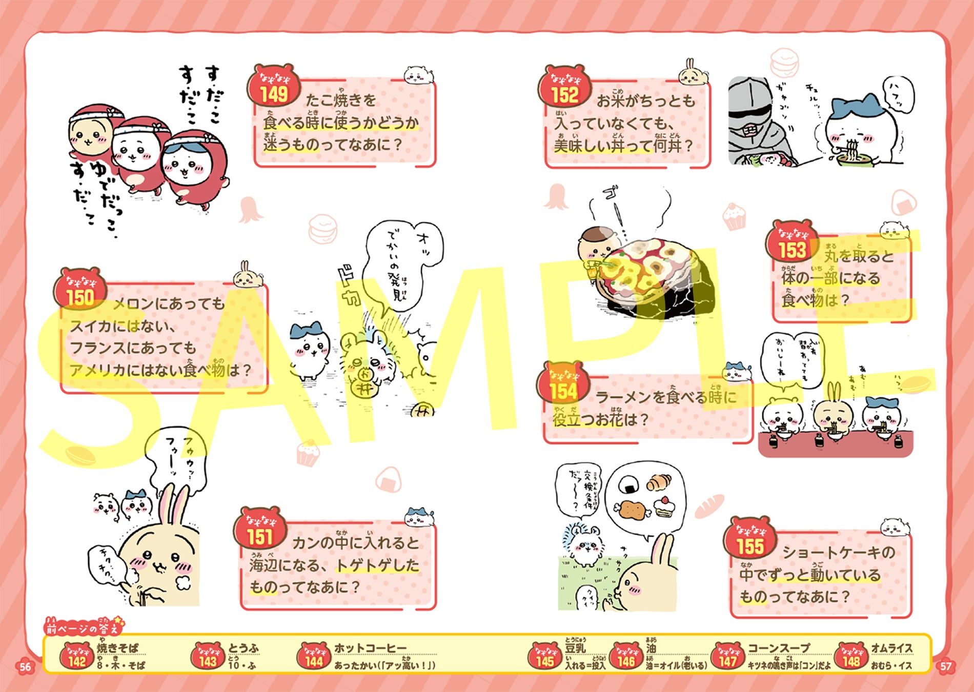 ちいかわたちの可愛いイラストとともに、オリジナルのなぞなぞ全222問を掲載しています。