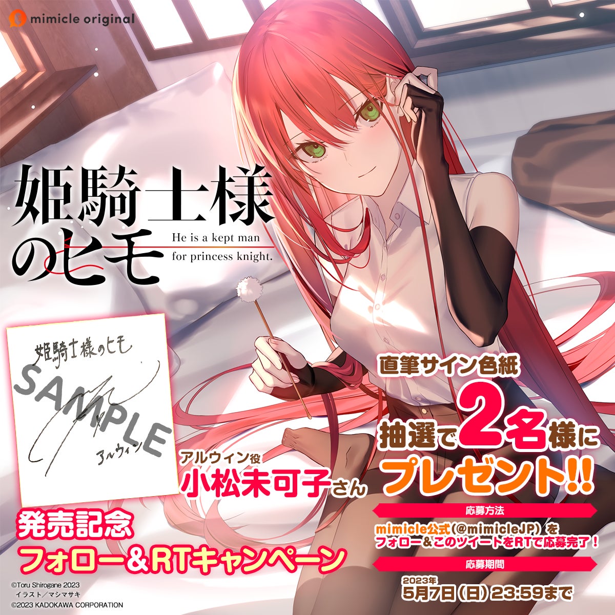 『姫騎士様のヒモ 姫騎士様に飼い慣らされるASMR』の発売を記念してフォロー&RTキャンペーンを開催。キャンペーン期間中にmimicle公式Twitter(@mimicleJP)をフォローしたうえでキャンペーンツイートをリツイートすれば応募完了となります。抽選で2名様に「アルウィン役 小松未可子さん直筆サイン色紙」をプレゼントいたします。