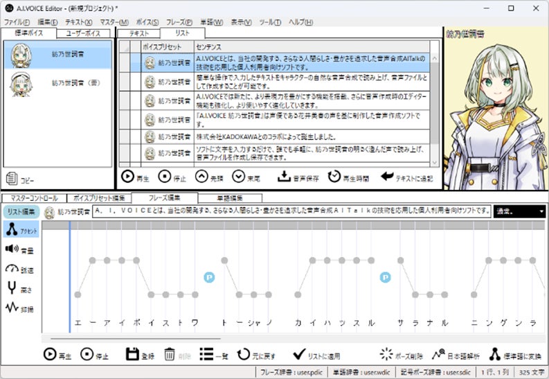 『A.I.VOICE 紡乃世詞音』は、声優・花井美春の声をベースに、簡単に多様な音声を制作できるソフトです。ソフトに文字を入力するだけで、誰でも手軽に、元気で明るい声で読み上げ、音声ファイルを作成し保存が可能です。※喜・怒・悲のボイススタイルに対応。