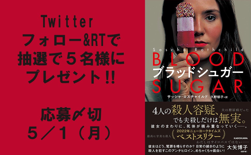 <Twitterプレゼントキャンペーンについて> ・プレゼントキャンペーン名称 『ブラッドシュガー』プレゼントキャンペーン【2023】 ・プレゼント賞品 『ブラッドシュガー』1冊を抽選で5名さまにプレゼント! ・応募方法 (1)KADOKAWA翻訳書籍Twitterアカウント「@kadokawahonyaku」をフォローする。(https://twitter.com/kadokawahonyaku) (2)所定のキャンペーンツイートをRT(リツイート)する。 (3)エントリー完了! ※あらかじめ注意事項をご確認のうえでご応募ください。 ・応募しめ切り 2023年5月1日(月)23:59RT分まで ・当選発表 当選者へのみ、2023年5月10日ごろ、TwitterのDM(ダイレクトメッセージ)にて、「@kadokawahonyaku」よりお知らせします。 ※あらかじめDMを受け取れるよう設定してください。 ※当選の場合、2023年5月17日23時59分までに賞品送付先を登録いただく必要があります。かならず期日までにDMをご確認ください。 ・注意事項 ◎応募には、Twitterへの登録(無料)が必要です。 ◎当選はおひとりにつき1口までとなります。 ◎以下の場合は、応募をお受けできません。 ・非公開アカウントの場合 ・懸賞応募用アカウントやボット(bot)から応募した場合 ・当選発表以前に、応募ツイートを削除した場合 ・当選発表以前に、公式アカウント(@kadokawahonyaku)へのフォローを解除した場合 ・第三者の権利を侵害する内容及び公序良俗に反する内容など株式会社KADOKAWA(以下、弊社といいます)で不適切と判断した内容の場合 ◎応募に際し発生する通信料などは、お客様のご負担となります。 ◎賞品の発送は2023年5月下旬を予定しています(発送先は日本国内に限ります)。 ◎当選賞品を譲渡(転売、オークション出品含む)しないことが応募・当選の条件です。譲渡が明らかになった場合、当選は取り消され賞品をお返しいただく場合があります。 ◎当キャンペーンは、弊社が主催しています。TwitterおよびTwitter社とは関係ありません。 ◎Twitterおよび関連ツールの動作等の不測の障害により、当キャンペーンを予告なく変更・中止させていただく場合があります。 ◎応募に際しご提供いただいた個人情報は、弊社のプライバシーポリシー(https://group.kadokawa.co.jp/privacy_policy/main.html)の定めるところにより取り扱わせていただきます。 ◎応募に際しお客様に生じた損害等につきましては、弊社に重過失のある場合を除き、弊社は一切賠償の責を負わないものとします。 <本キャンペーンのお問い合わせ> KADOKAWA カスタマーサポート https://wwws.kadokawa.co.jp/support/contact/ ※「『ブラッドシュガー』キャンペーンについて」とご明記ください。 ※サポートは日本国内に限ります。 KADOKAWA翻訳書籍の公式Twitterアカウントはコチラ →https://twitter.com/kadokawahonyaku |
