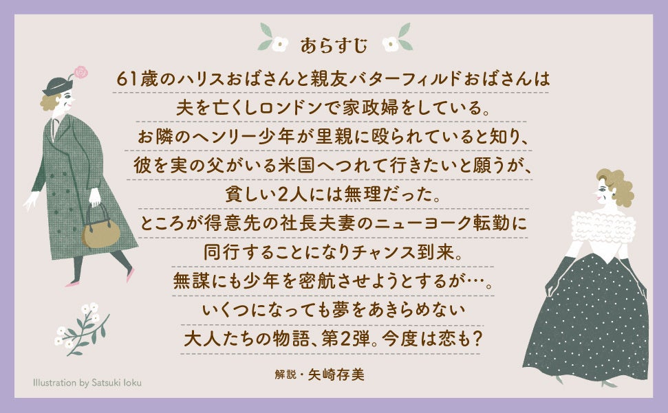 61歳のハリスおばさんと親友バターフィルドおばさんは夫を亡くしロンドンで家政婦をしている。お隣のヘンリー少年が里親に殴られていると知り、彼を実の父がいる米国へつれて行きたいと願うが、貧しい2人には無理だった。ところが得意先の社長夫妻のニューヨーク転勤に同行することになりチャンス到来。無謀にも少年を密航させようとするが…。何歳(いくつ)になっても夢をあきらめない大人たちの物語、第2弾。今度は恋も? 解説・矢崎存美