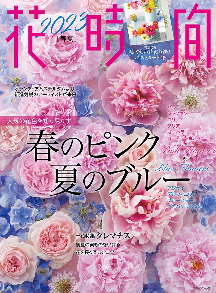 最新号2023春夏号では「春のピンク。夏のブルー」を特集テーマに、華やかで、涼やかな花の楽しみ方を提案中。