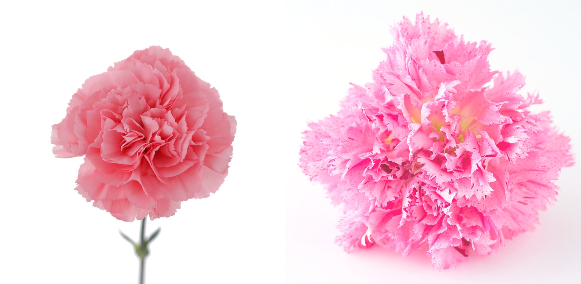 花びらを集めて咲く一般的なカーネーション(写真左)に対し、レリシア(写真右)は「花びらを大きく開き、華やか」。