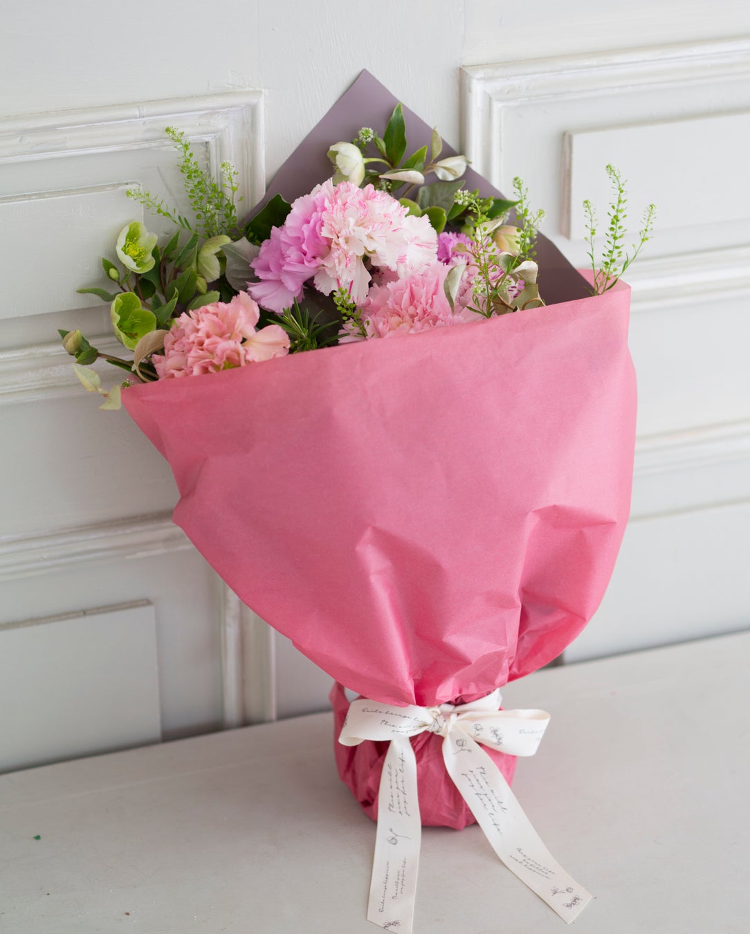ブーケは花色を美しく引き立てる2色のペーパーでラッピング。